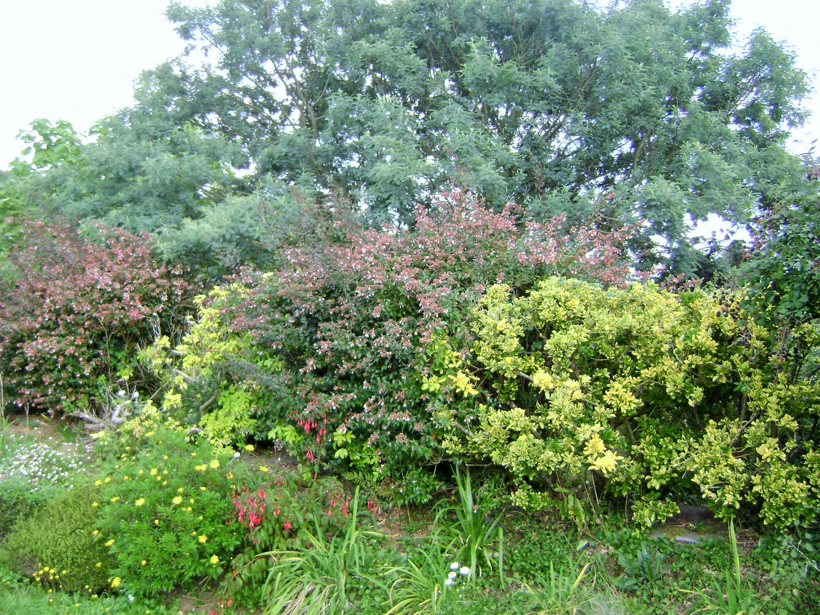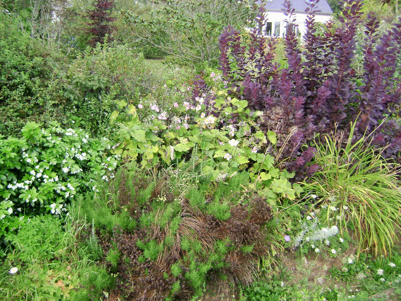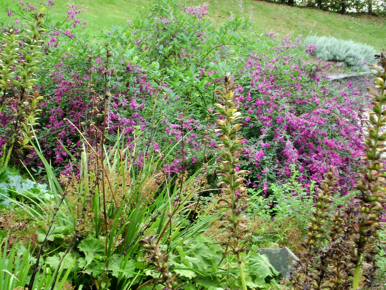 Mixed borders of dahlias and mumsMixed hedgesMixed hedge shrubs with accent of black eyed susansMixed shrubs ad texture, color and interestUnderplanting of heatherAcanthus grows by the mailboxSilk tree in bloomPurple leaf barberryHydrangeas and dahliasA shady cornerShade loving plants