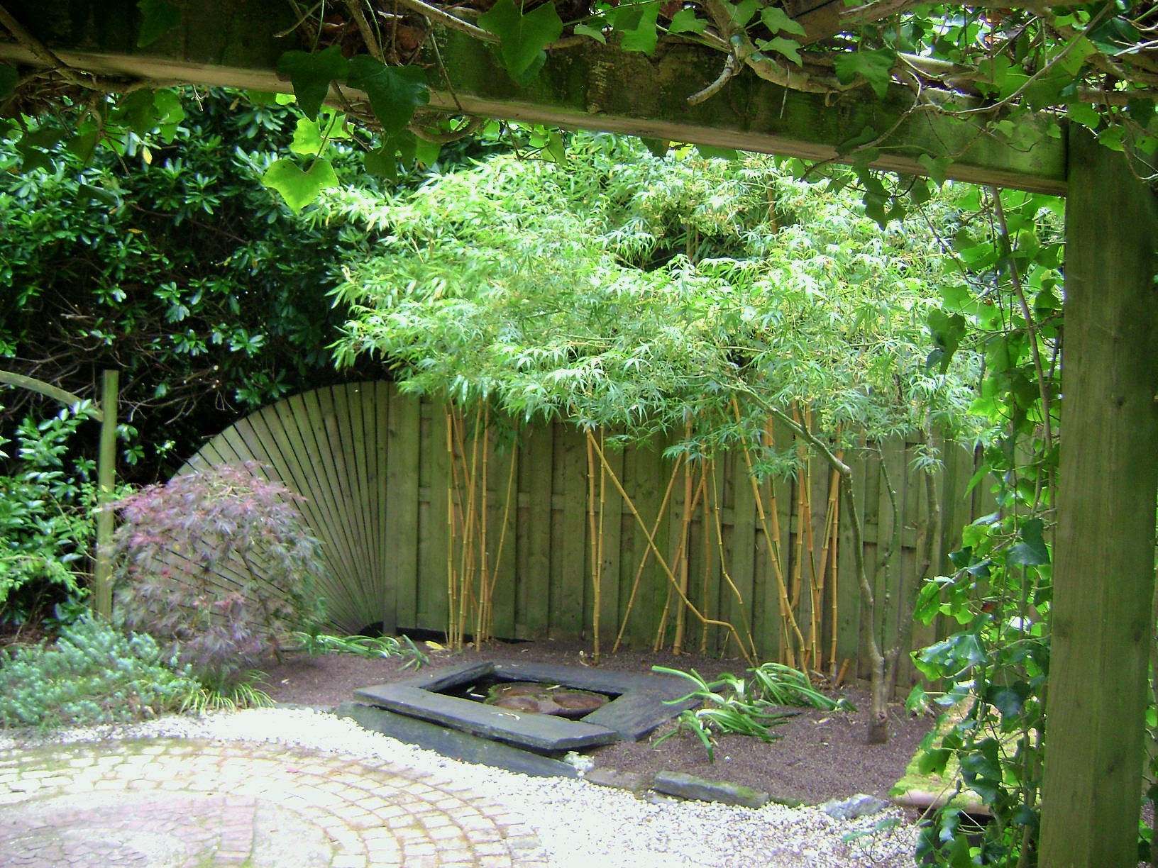 At the entrance of the Japanese garden is a small pavilion; note the intricate paving, the bamboo, and water feature.