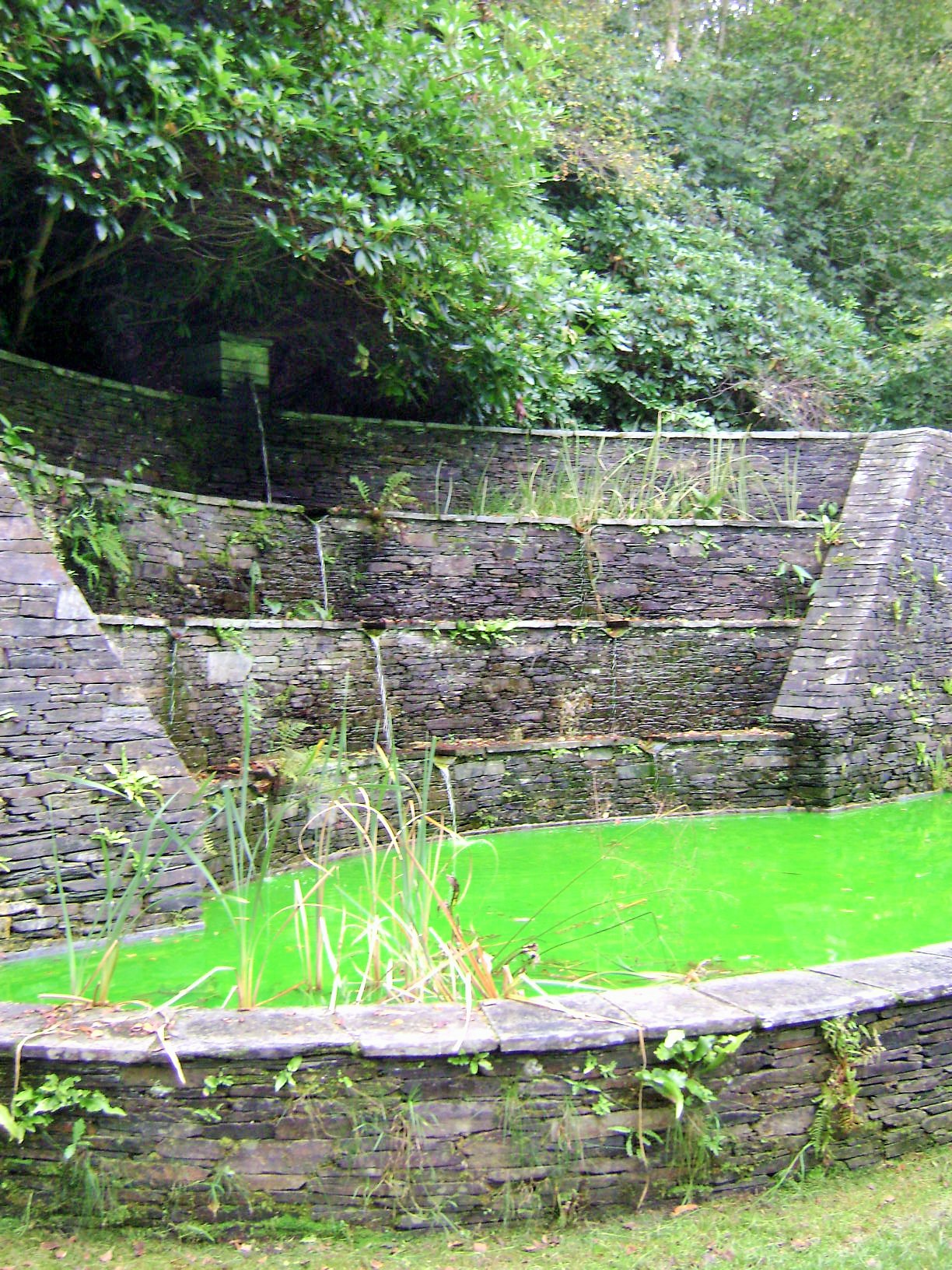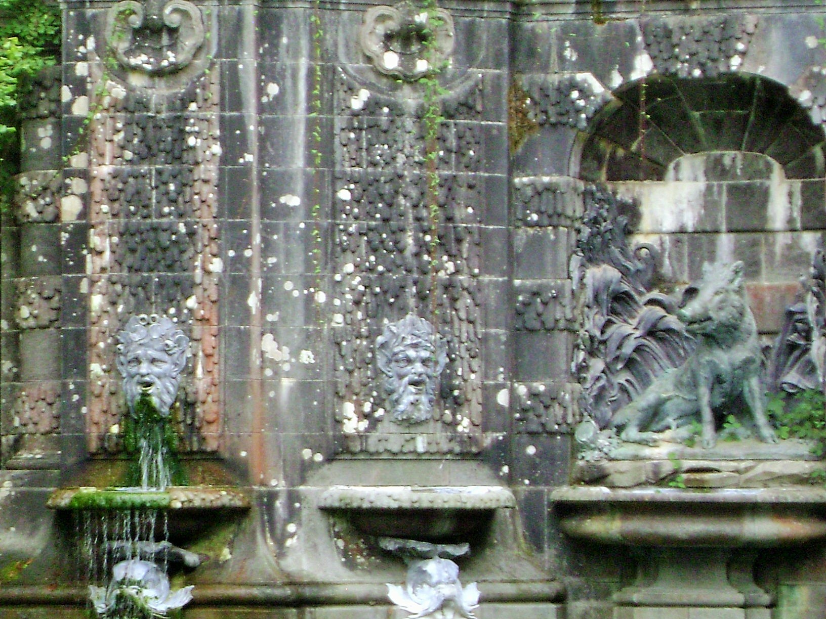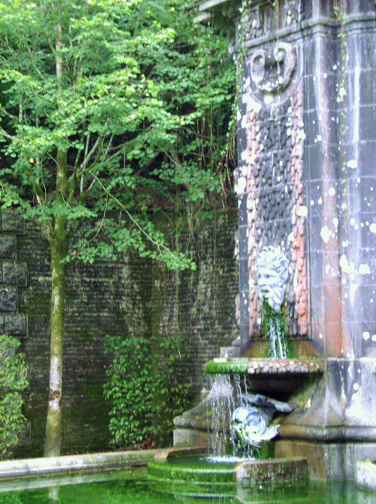 In this post, I am featuring one of my favorites of the Trevarez gardens, the Italian garden. It features a pond and grotto, a row of unusual fountains, and a lawn all along the side with a small water canal leading to the stairs going to the Romantic Garden. The Italian Garden is just to the side of the castle.