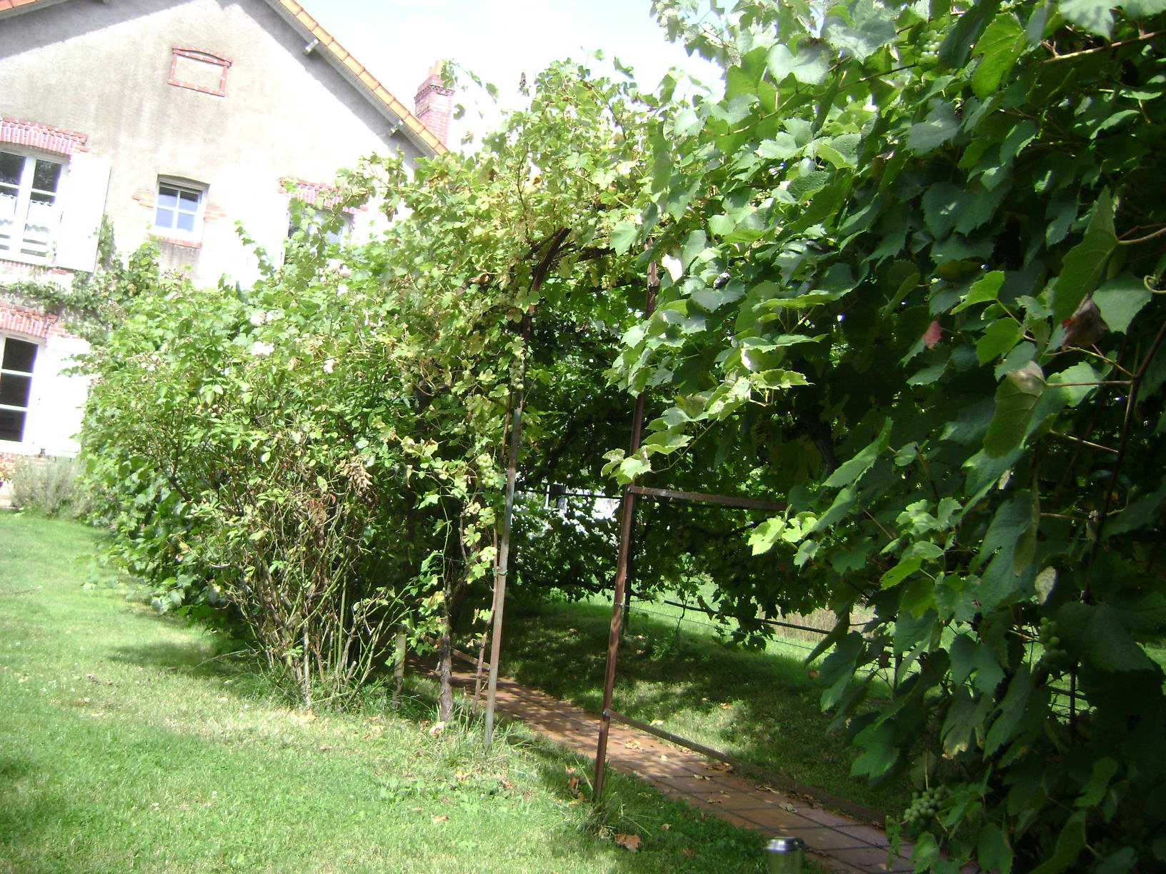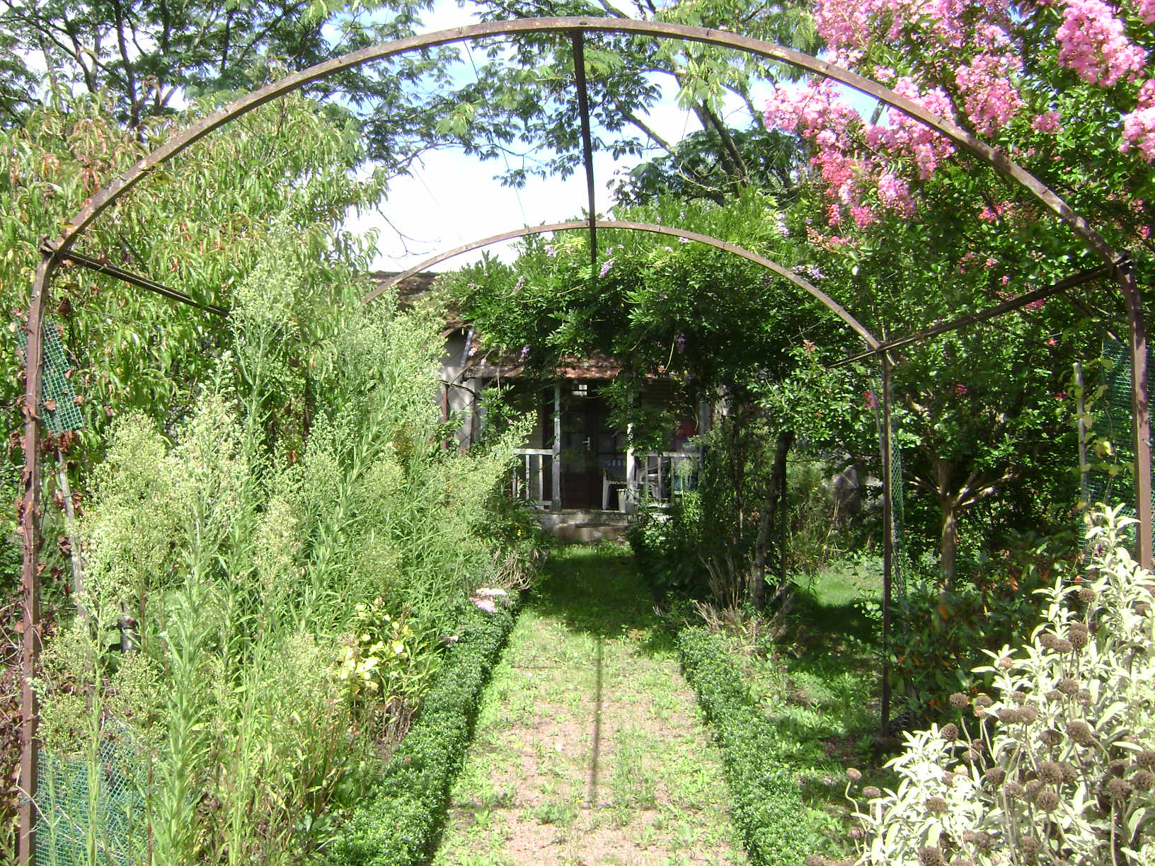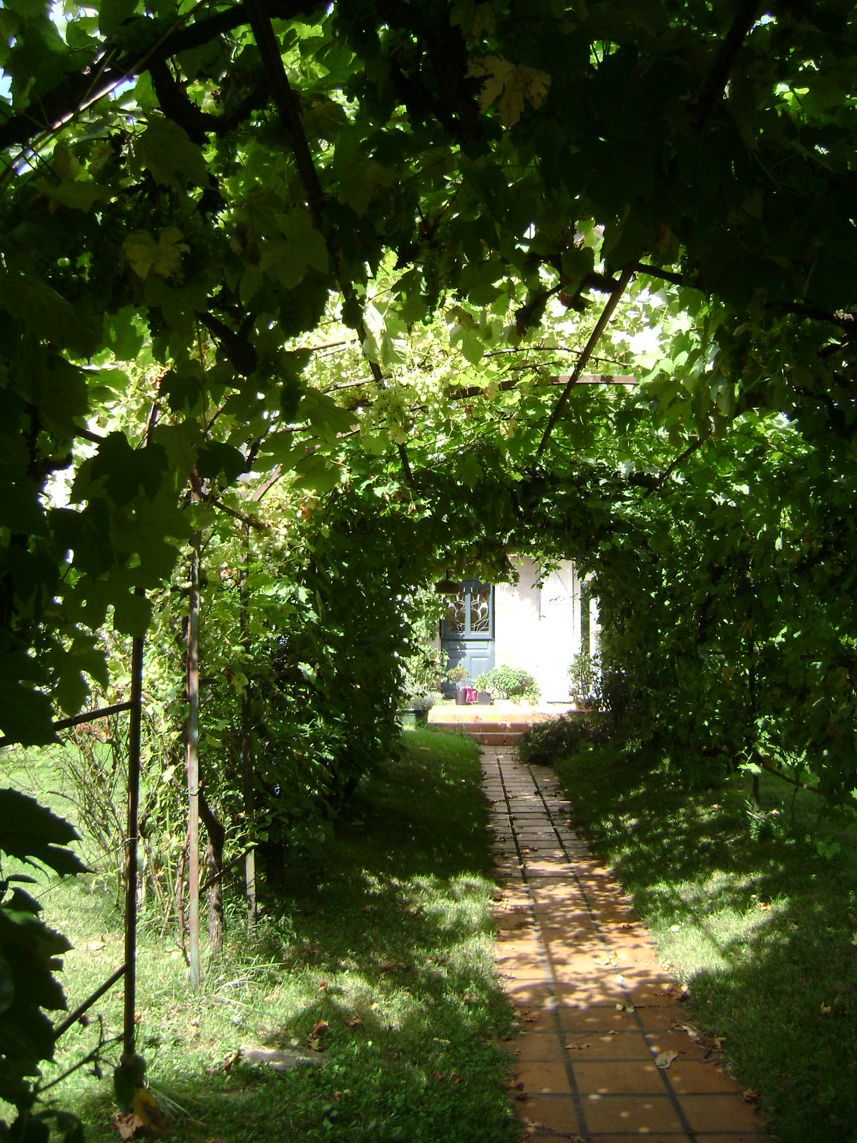 Both gardens in Suce sur Erdre, a small town in southern Brittany, France, are designed around a long alley with an arbor, leading from the gate to the house. Wisteria is only starting to cover the first one towards the house, while the second is covered from one end to the other in grapevines. Both arbors are made of metal, treated to withstand the humidity and rain prevalent in Brittany, particularly over the winter.