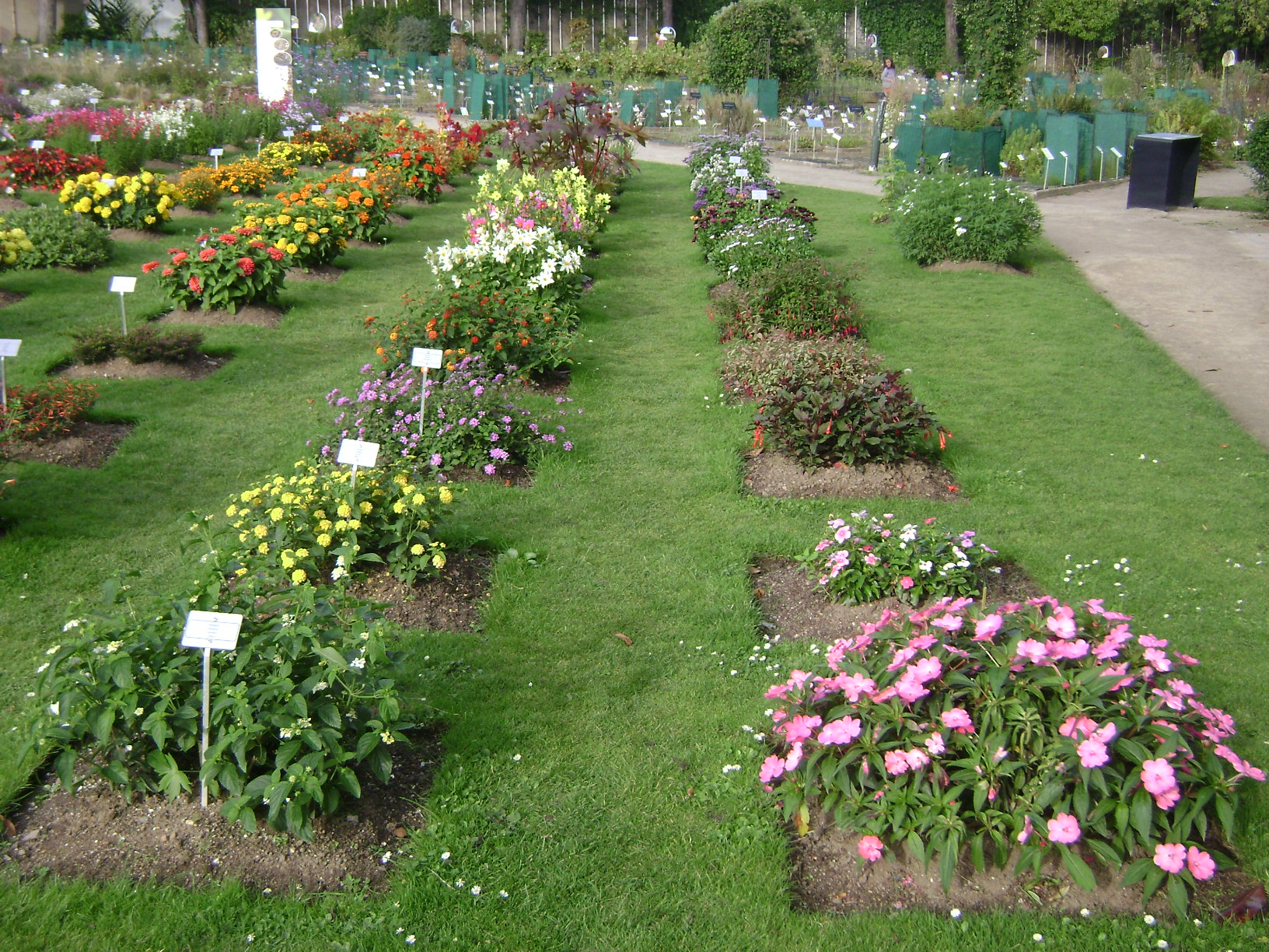 A lawn arae is divided up to showcase individual flowering plants, all of which are labeled and referenced, lantanas, Buenos aires verbena, geraniums, begonias, etc
