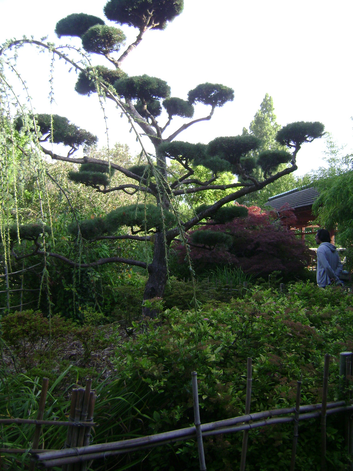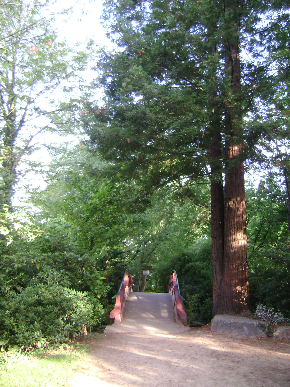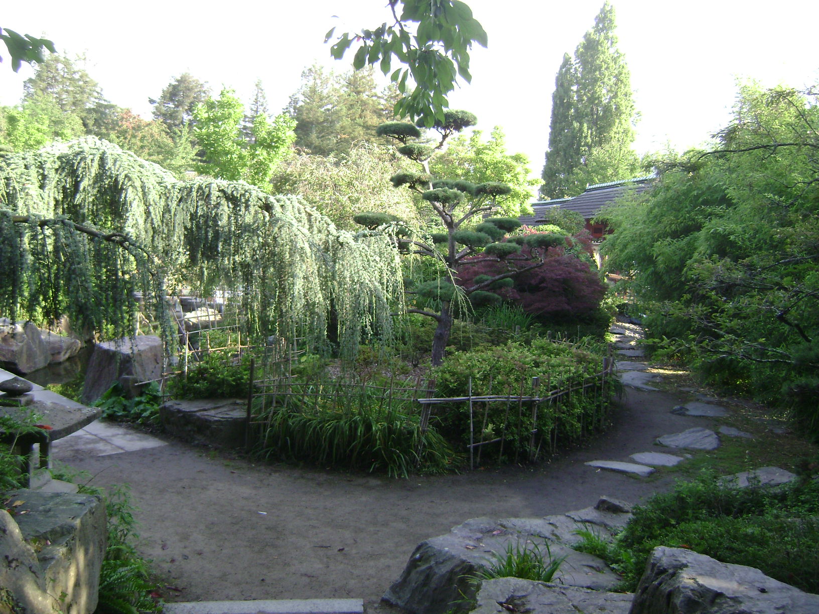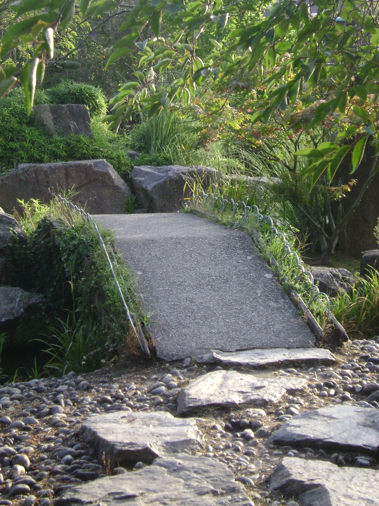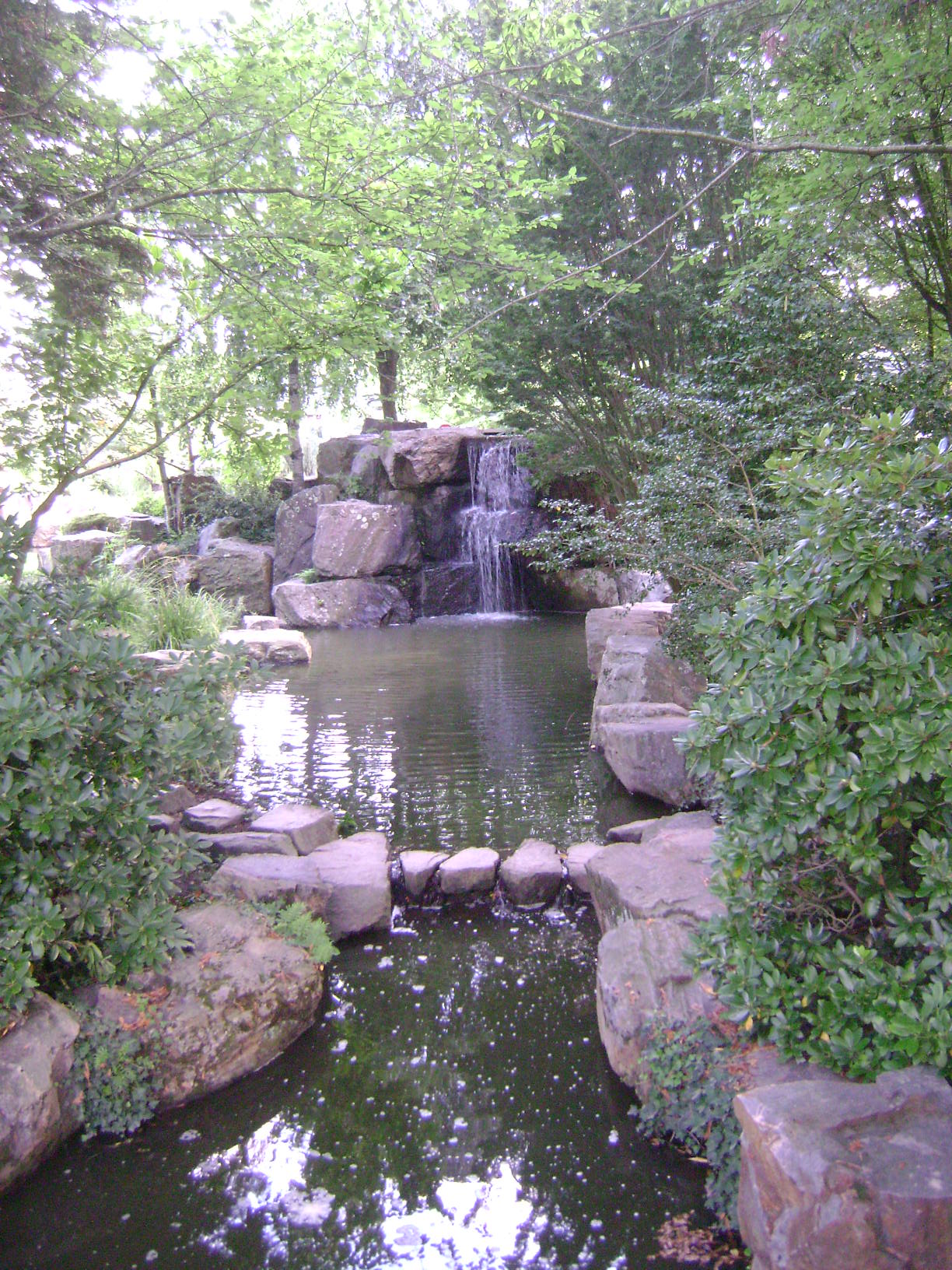 The garden features meandering paths, benches, a waterfall, bamboo groves, water features, and numerous shade tolerant plants including hostas, as well as spireas and a variety of evergreens.