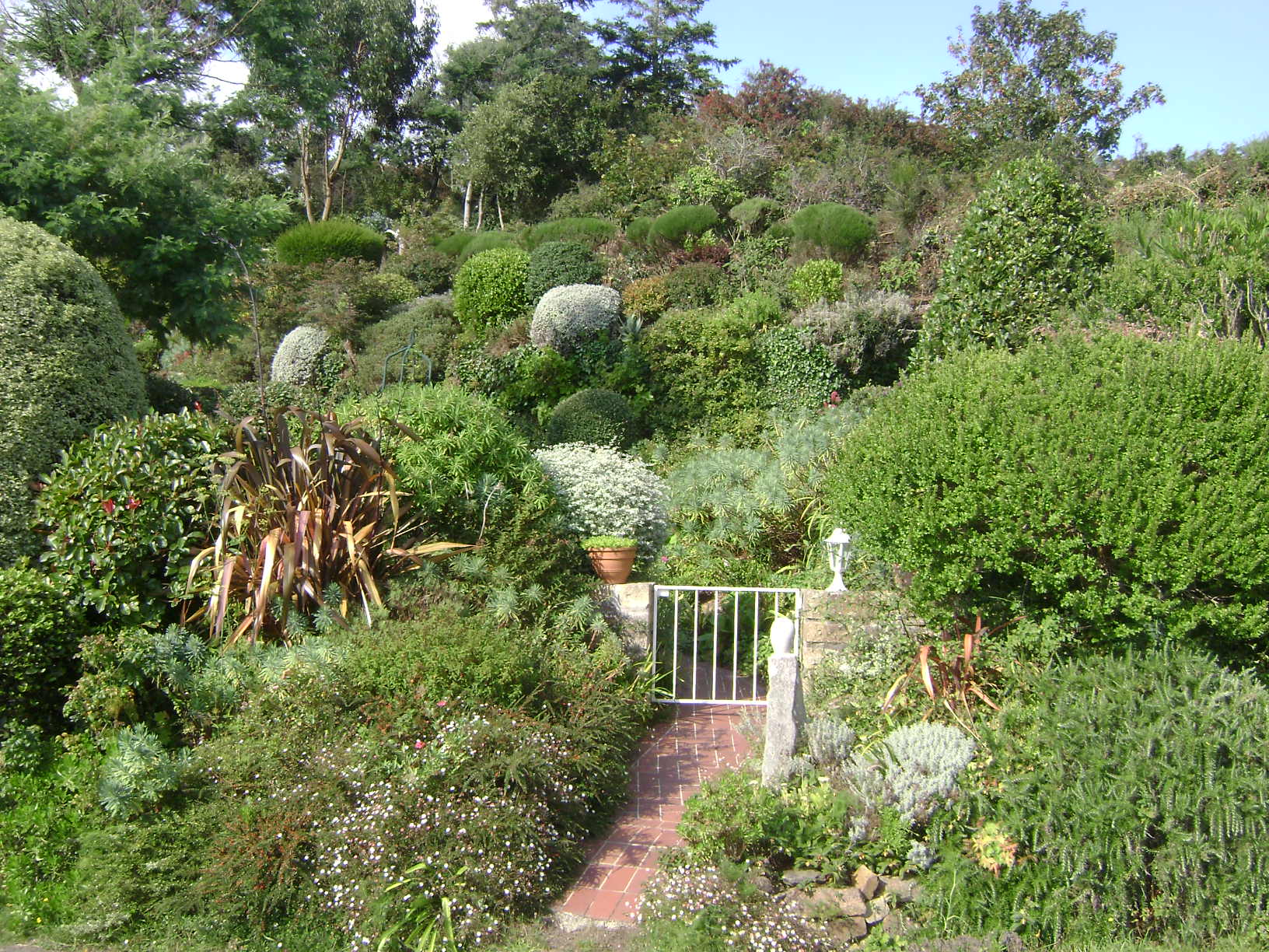Some of the plantings include apple and pear trees, a hedge of fuschias (a variety common to this coastal region which is winter hardy there and will grow over six feet tall), blue agapanthus, and oleander. Box hedges on the ocean side open to narrow stairs leading down to the water. Just imagine puttering around the garden in such a setting!