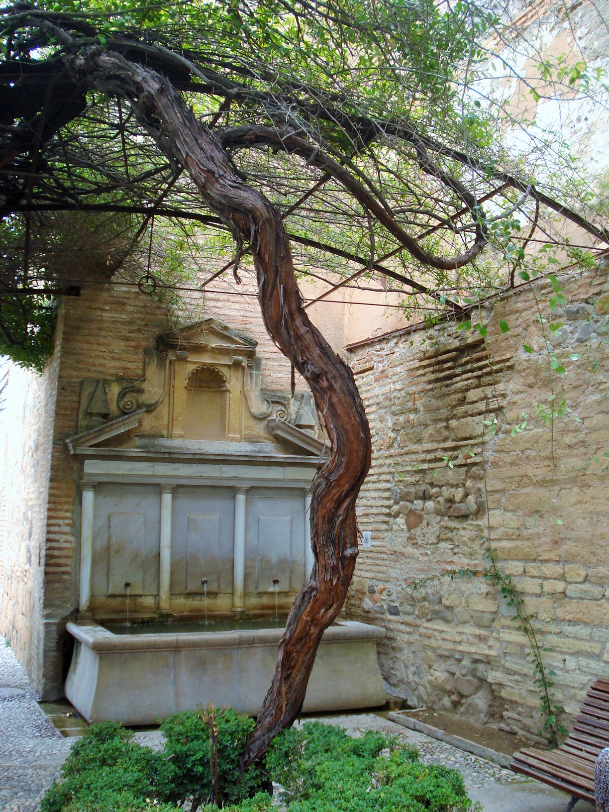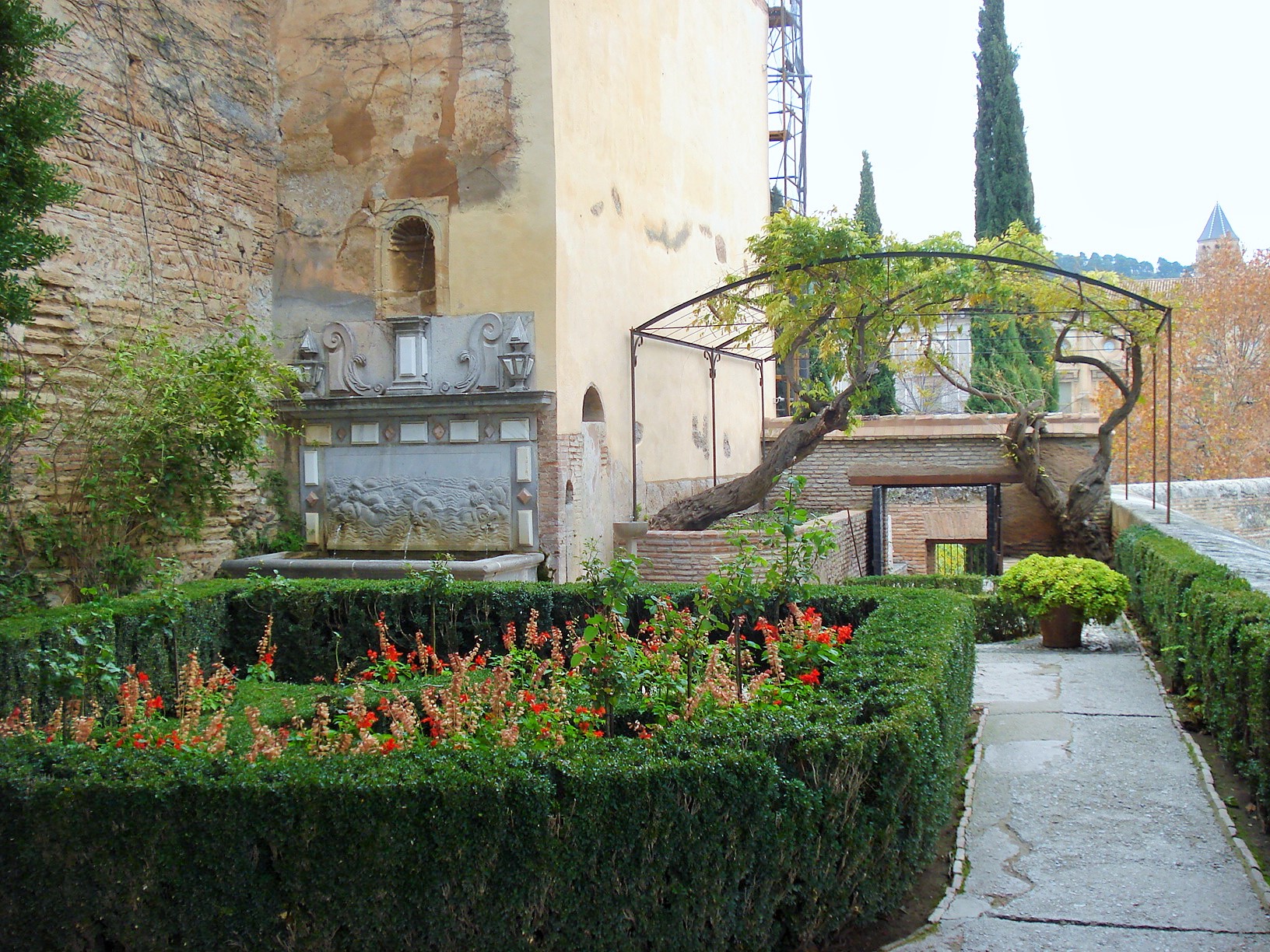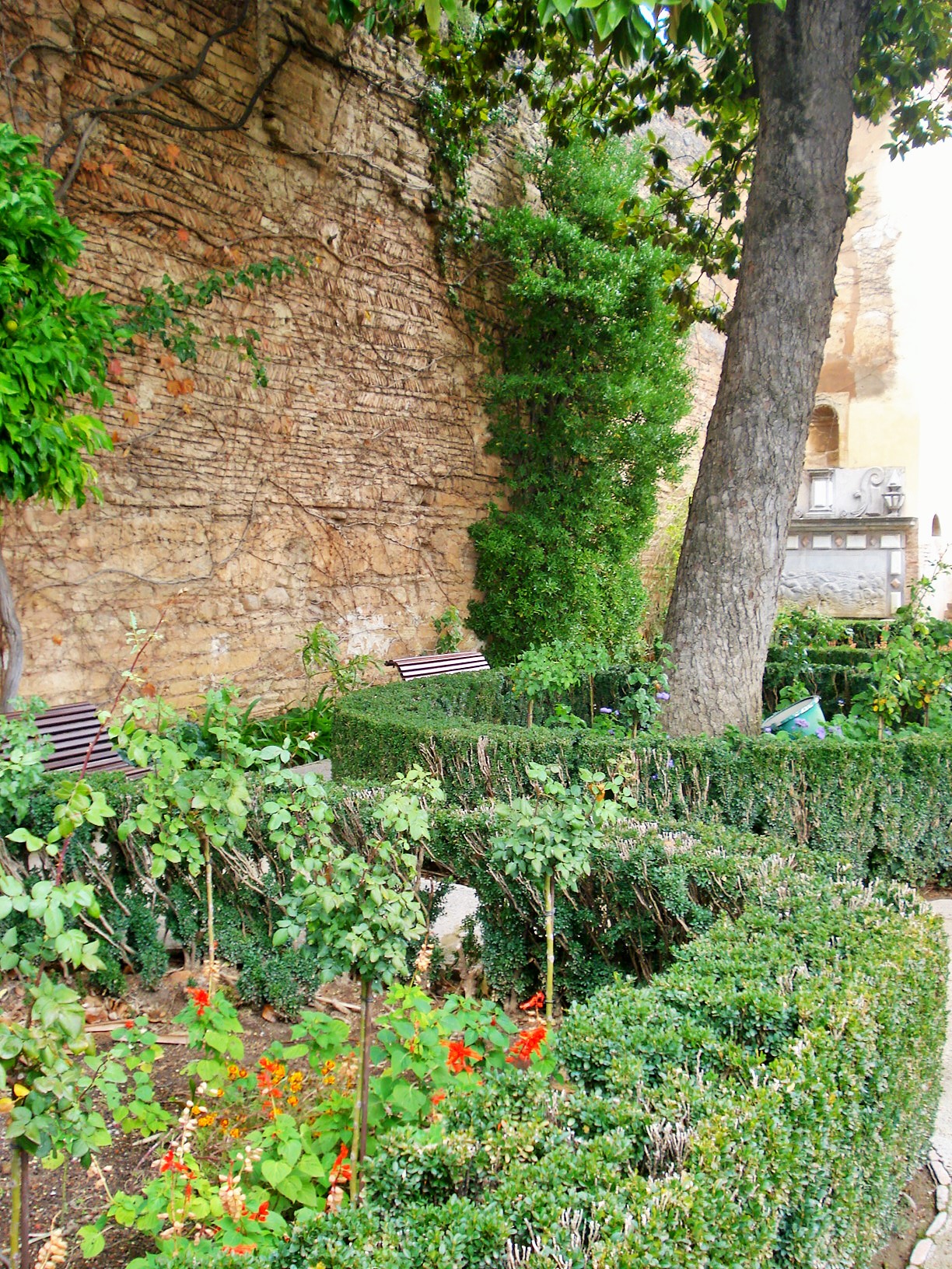 Granada, in southern Spain, is of course most famous for the Alhambra and Generalife gardens. The Alcazaba was built as a fortress and is the oldest part of the Alhambra. The gardens of the Alcazaba are small but offer sweeping views of the city, as well as fountains and other features typically found in Moorish style gardens.