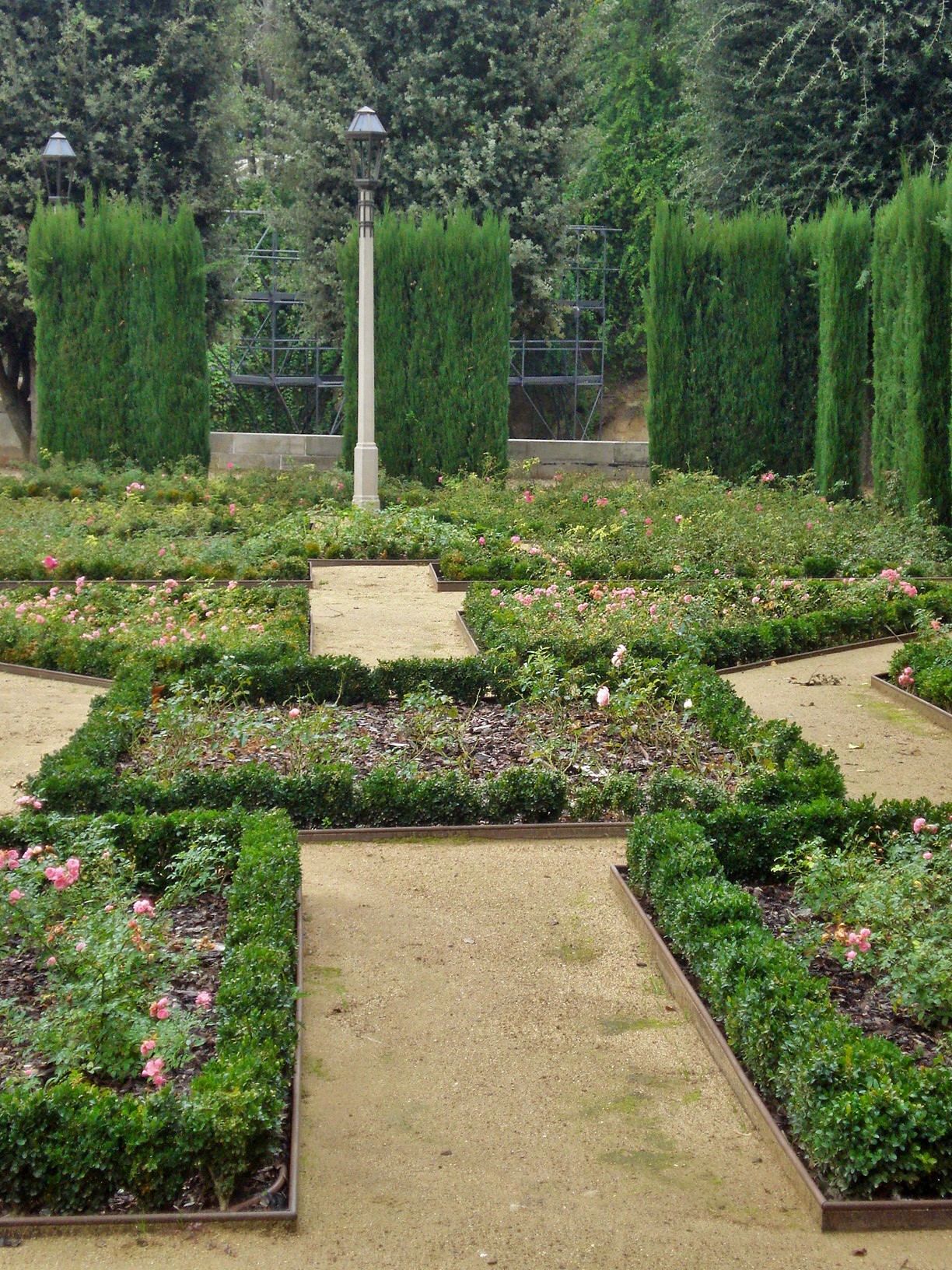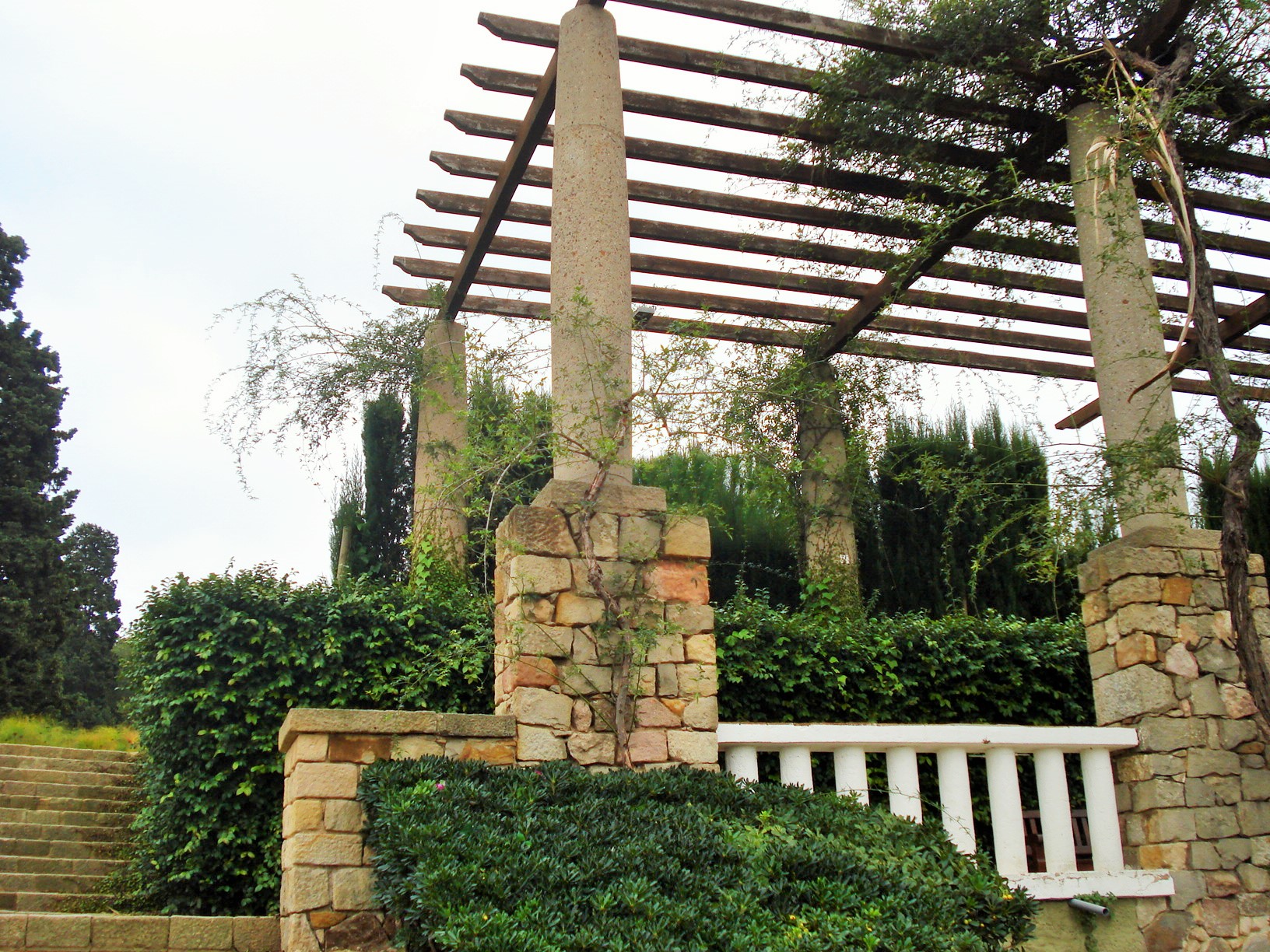 This lovely garden is adjacent to the Laribal Gardens, and starts with a larger terrace at top with a formal layout of rose borders and trees overlooking the greek theater, then a long pergola allows for sitting and enjoying the view over the rest of the mountain. Click here for an excellent article on these gardens.