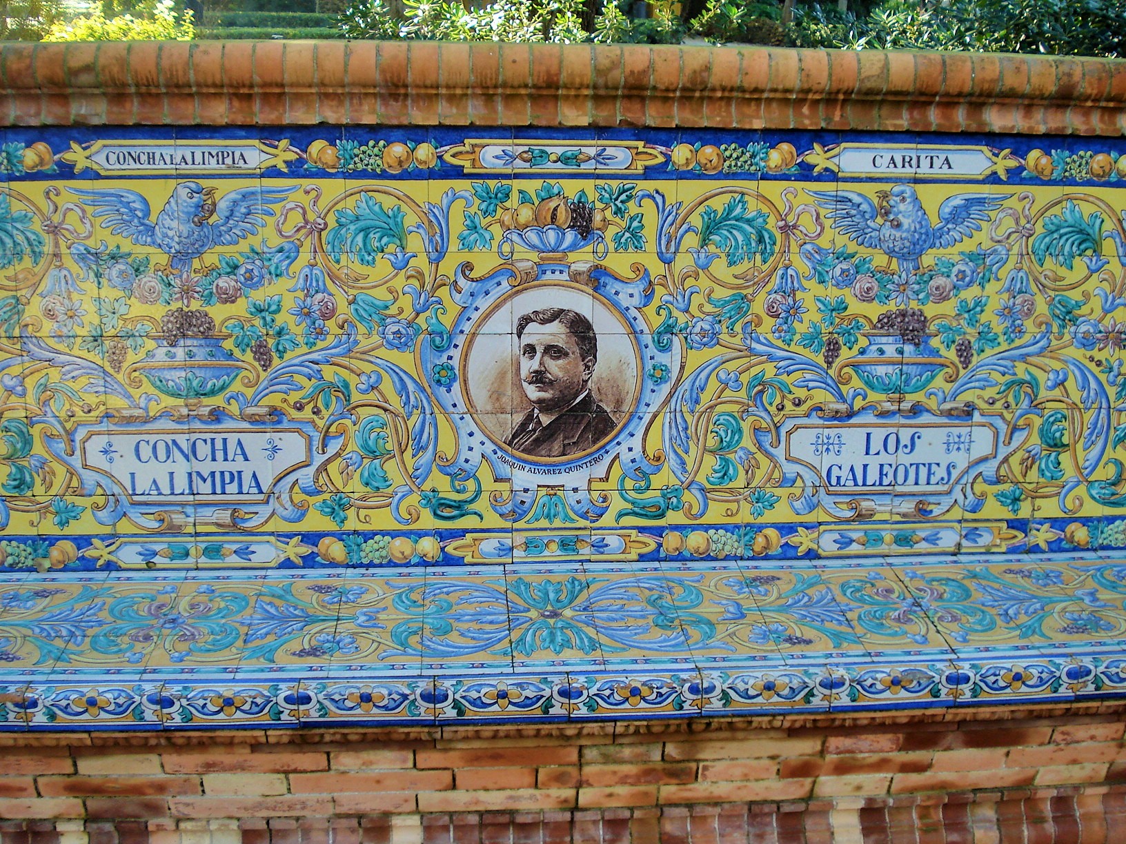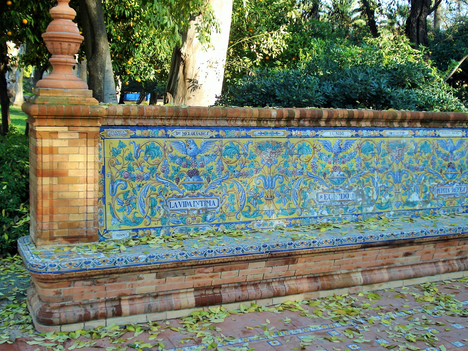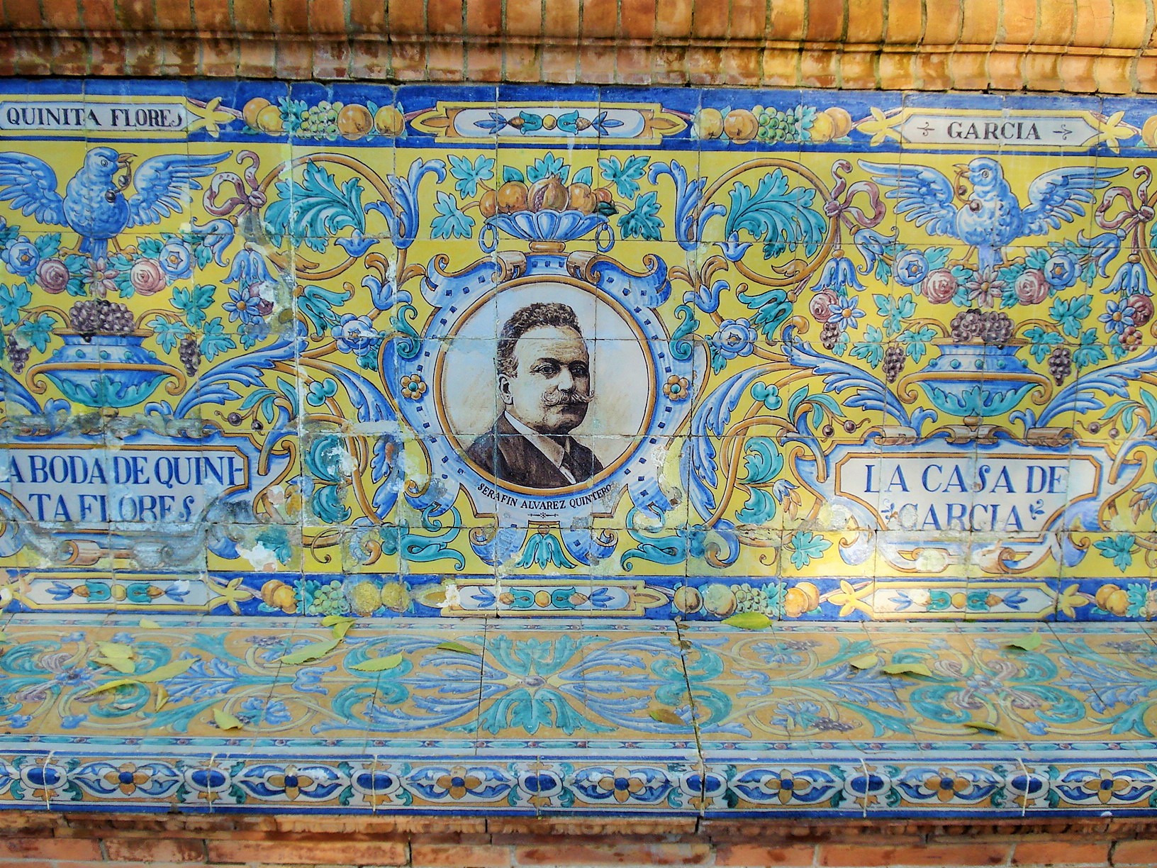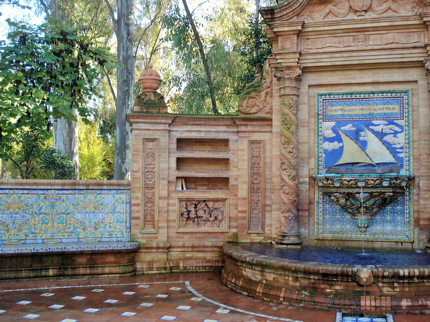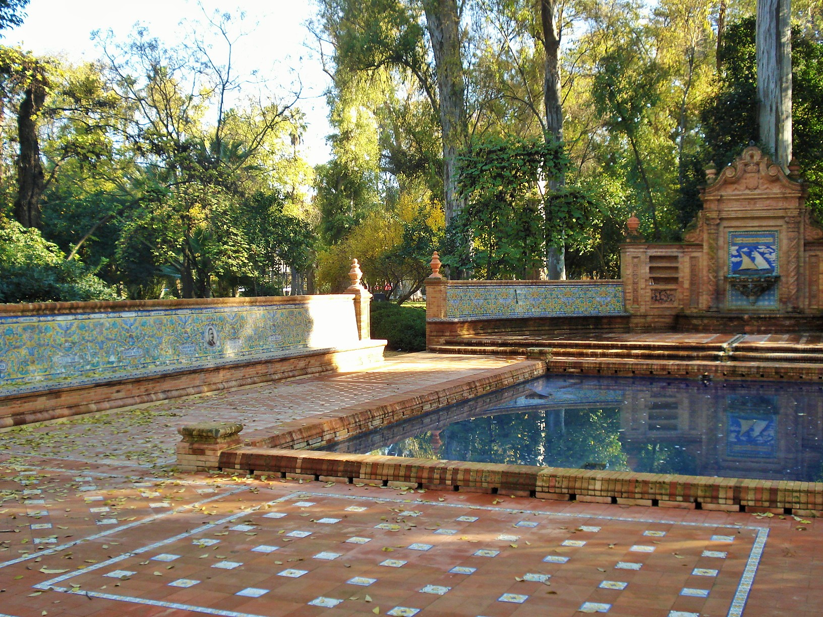 This park being such an expansive and complex creation, I am featuring it through several posts.This first one showcases the Garden of the Lions (11) and the Fountain of the Alvarez Quintero Brothers (14) just behind it. Both are stunning in very different ways. The Fountain of the Lions features large fountains surrounded with sculptures and geometrical borders with a clear Moorish influence. The Quintero fountain is a masterpiece of tile work that ties in with the incredibly detailed allover moasaics of the Plaza de Espana at the other end of the park.