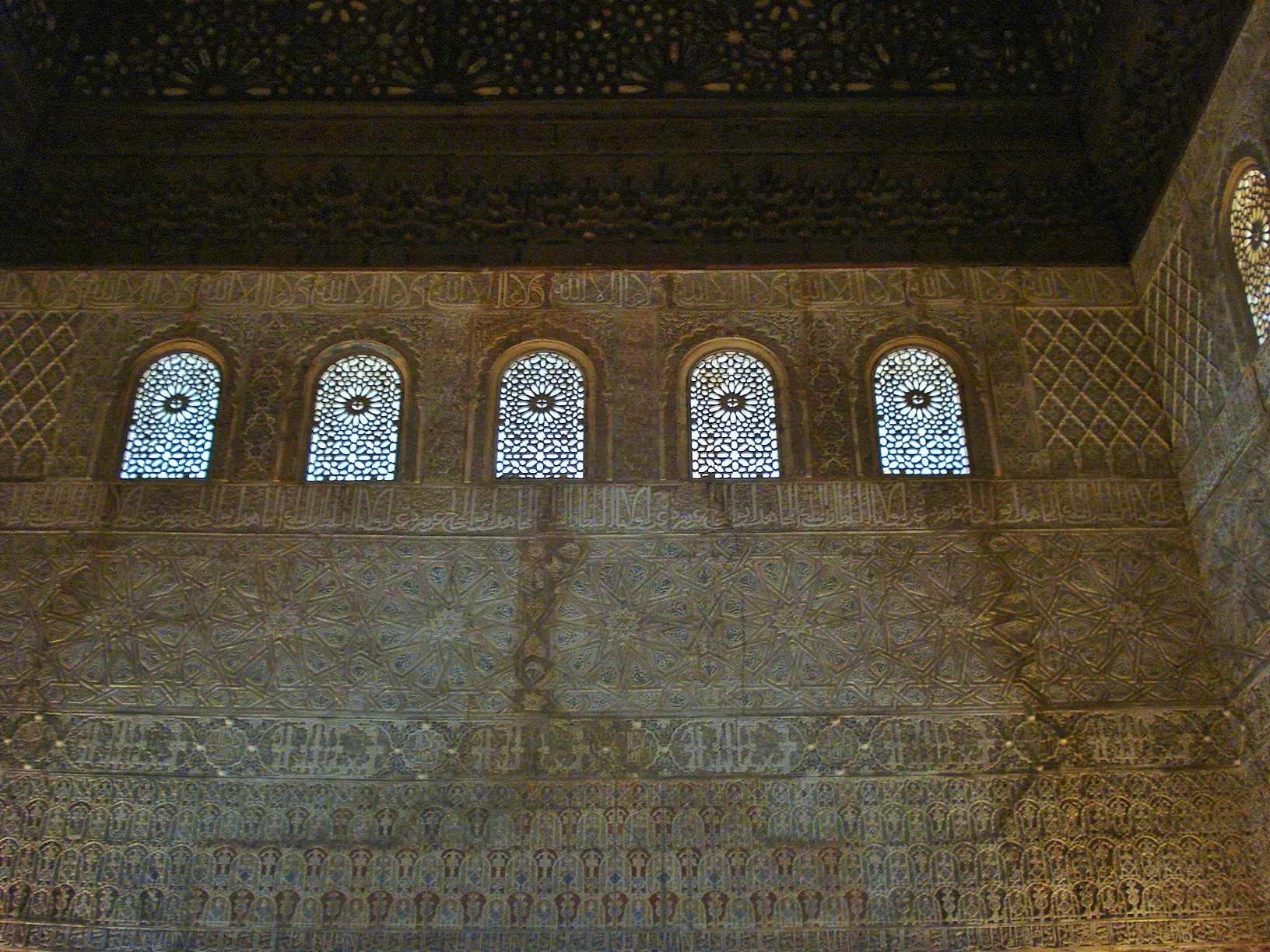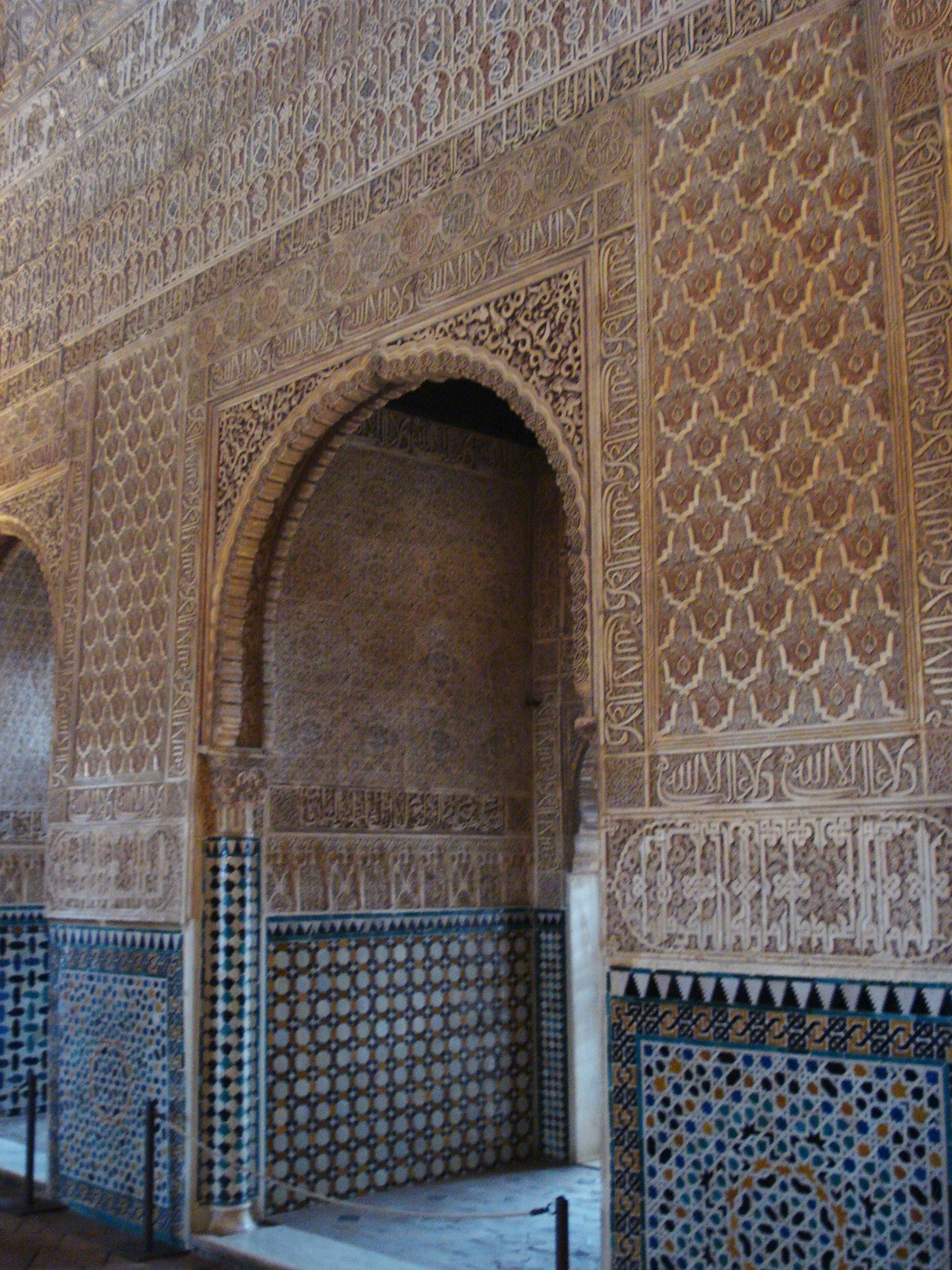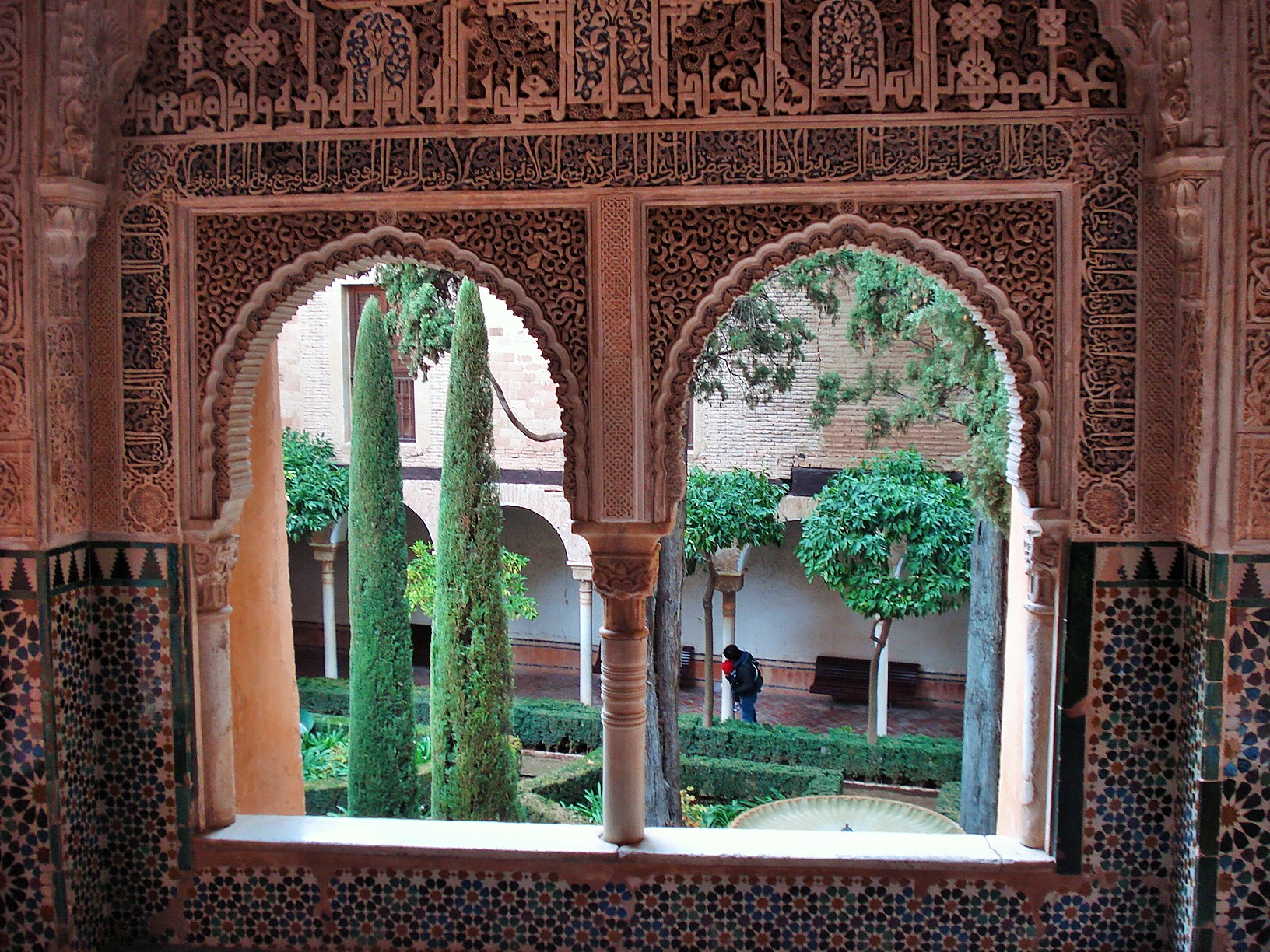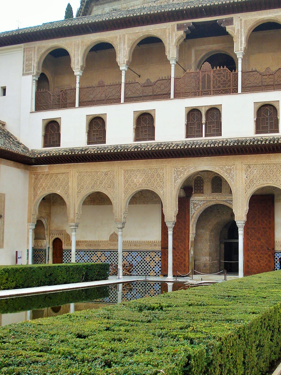 According to Wikipedia, “The Court of the Myrtles (Patio de los Arrayanes) is part of the palace and fortress complexe of the Alhambra. It is located east of the “Guilded Room” (Cuarto Dorado) and west of the “Patio of the Lions” and the Baths. Its current name is due to the myrtle bushes that surround the central pond and the bright green colour of which contrasts with the white marble of the patio. It was also called the Patio of the Pondor or the Reservoir (Patio del Estanque o de la Alberca) because of the central pond, which is 34 metres long and 7,10 meters wide.[1] The patio is divided in two sides by the pond, which receives its water from two fountains. The espace has chambers and porticoes around it. These porticoes rest on columns with cubic capitals, which have seven semicircular arches decorated with fretwork rhombuses and inscriptions praising God. The central arch is greater than the other six and has solid scallops decorated with stylised vegetal forms and capitals of mocarabes.”