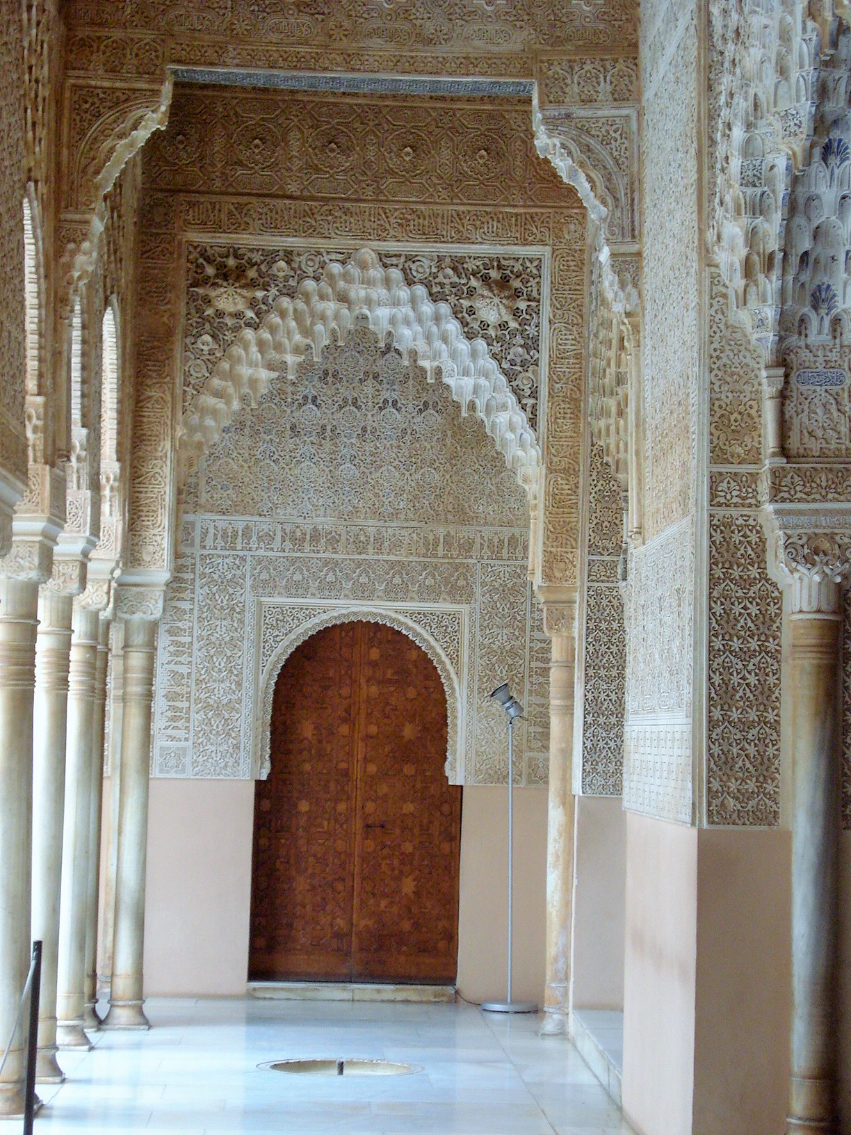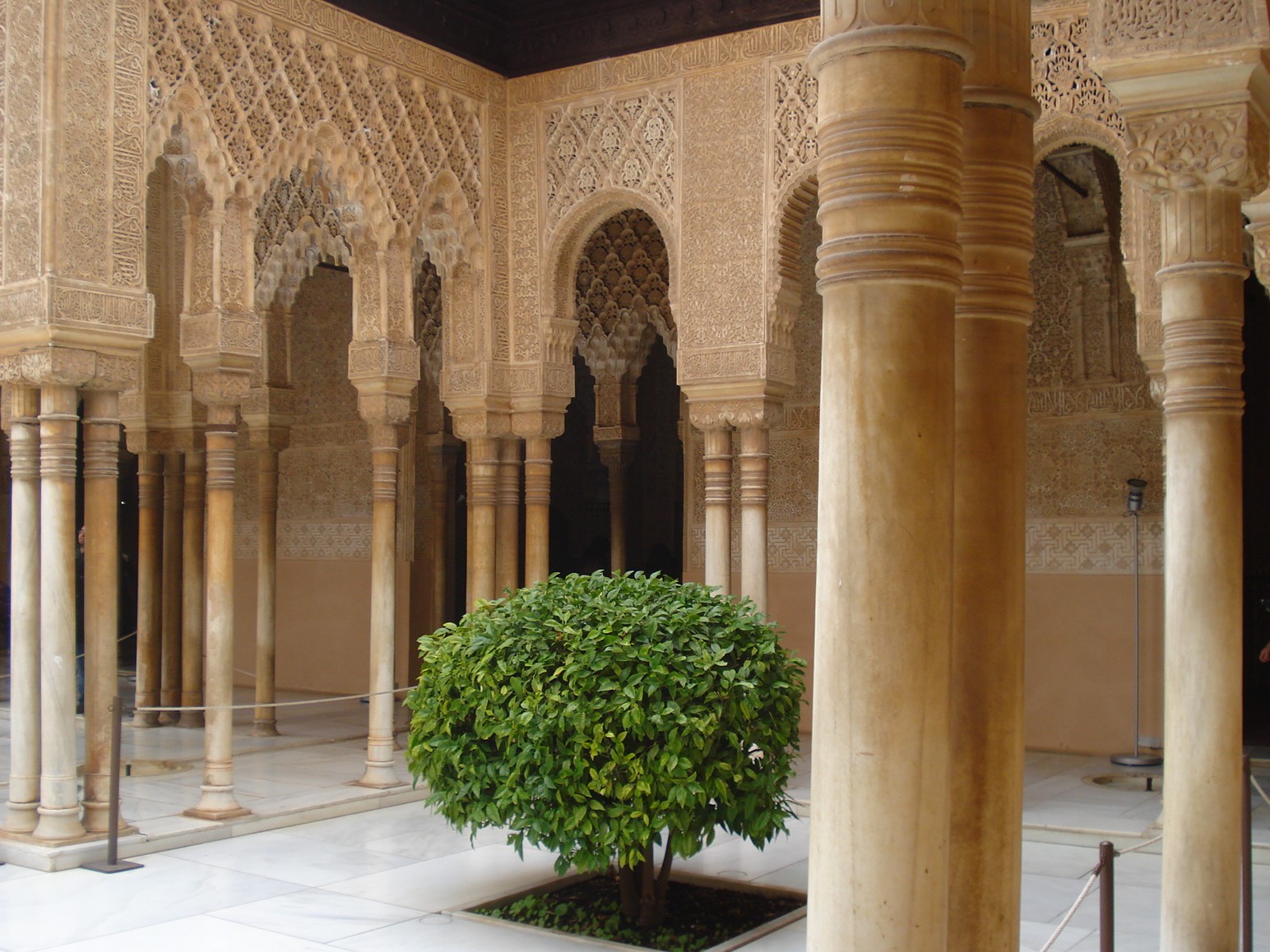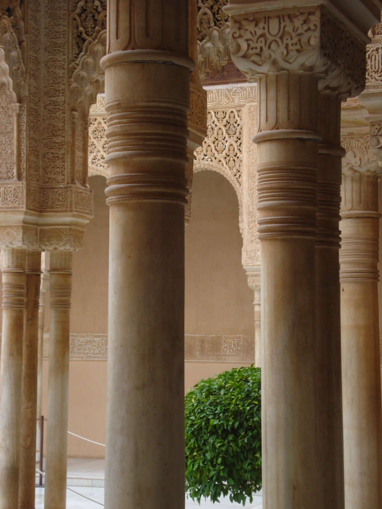 According to Wikipedia, “The Court of the Myrtles (Patio de los Arrayanes) is part of the palace and fortress complexe of the Alhambra. It is located east of the “Guilded Room” (Cuarto Dorado) and west of the “Patio of the Lions” and the Baths. Its current name is due to the myrtle bushes that surround the central pond and the bright green colour of which contrasts with the white marble of the patio. It was also called the Patio of the Pondor or the Reservoir (Patio del Estanque o de la Alberca) because of the central pond, which is 34 metres long and 7,10 meters wide.[1] The patio is divided in two sides by the pond, which receives its water from two fountains. The espace has chambers and porticoes around it. These porticoes rest on columns with cubic capitals, which have seven semicircular arches decorated with fretwork rhombuses and inscriptions praising God. The central arch is greater than the other six and has solid scallops decorated with stylised vegetal forms and capitals of mocarabes.”