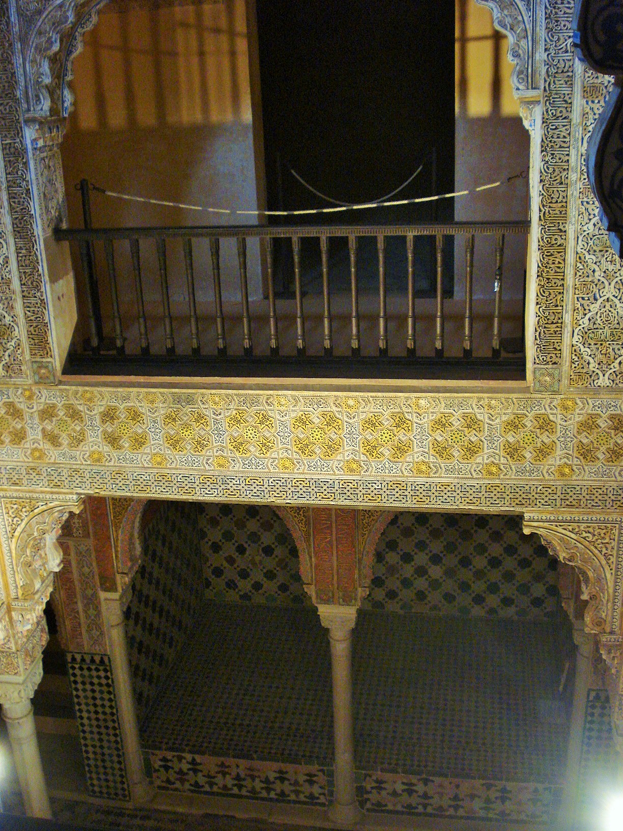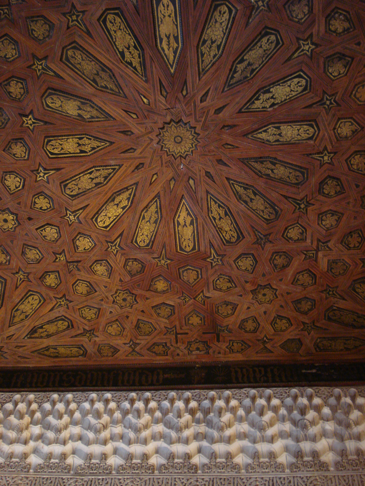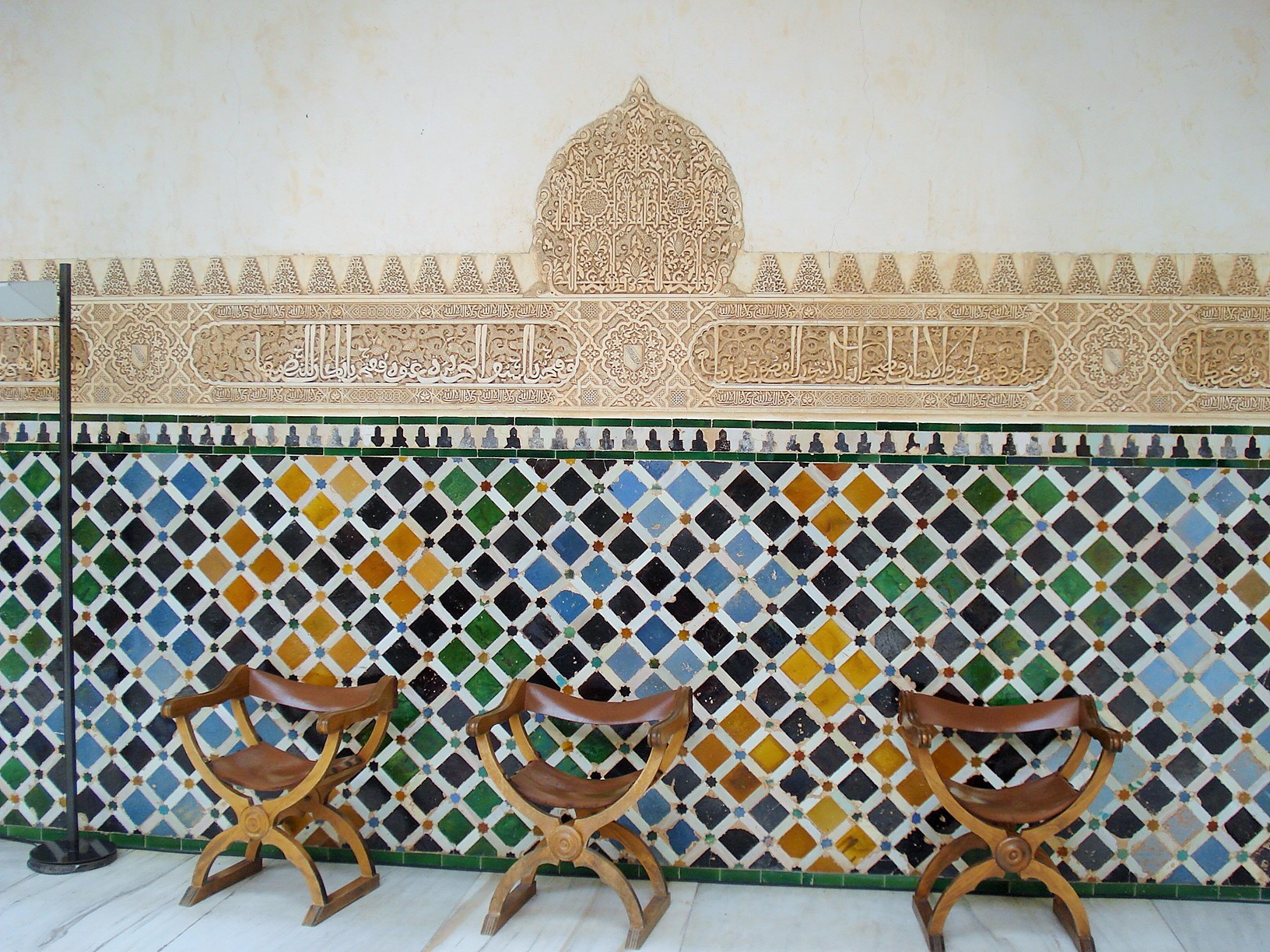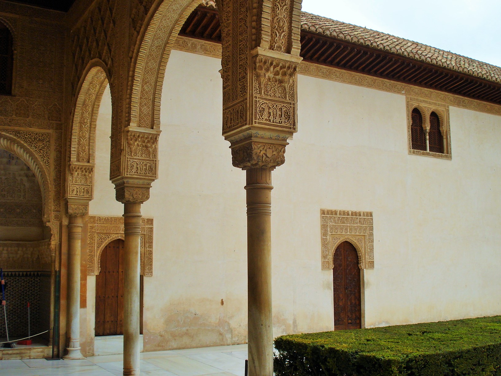 According to Wikipedia, “The Court of the Myrtles (Patio de los Arrayanes) is part of the palace and fortress complexe of the Alhambra. It is located east of the “Guilded Room” (Cuarto Dorado) and west of the “Patio of the Lions” and the Baths. Its current name is due to the myrtle bushes that surround the central pond and the bright green colour of which contrasts with the white marble of the patio. It was also called the Patio of the Pondor or the Reservoir (Patio del Estanque o de la Alberca) because of the central pond, which is 34 metres long and 7,10 meters wide.[1] The patio is divided in two sides by the pond, which receives its water from two fountains. The espace has chambers and porticoes around it. These porticoes rest on columns with cubic capitals, which have seven semicircular arches decorated with fretwork rhombuses and inscriptions praising God. The central arch is greater than the other six and has solid scallops decorated with stylised vegetal forms and capitals of mocarabes.”
