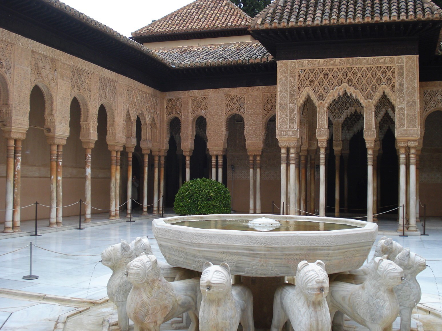 Also in Wikepedia, “The Courtyard of the Lions is an oblong courtyard, 35 m in length and 20 m in width, surrounded by a low gallery supported on 124 white marble columns. A pavilion projects into the courtyard at each extremity, with filigree walls and light domed roof, elaborately ornamented. The square is paved with coloured tiles, and the colonnade with white marble; while the walls are covered 1.5 m up from the ground with blue and yellow tiles, with a border above and below enamelled blue and gold. The columns supporting the roof and gallery are irregularly placed, with a view to artistic effect; and the general form of the piers, arches and pillars is most graceful. They are adorned by varieties of foliage, etc.; above each arch there is a large square of arabesques; and over the pillars is another square of filigree work. In the center of the courtyard is the celebrated Fountain of Lions, a magnificent alabaster basin supported by the figures of twelve lions in white marble. ”