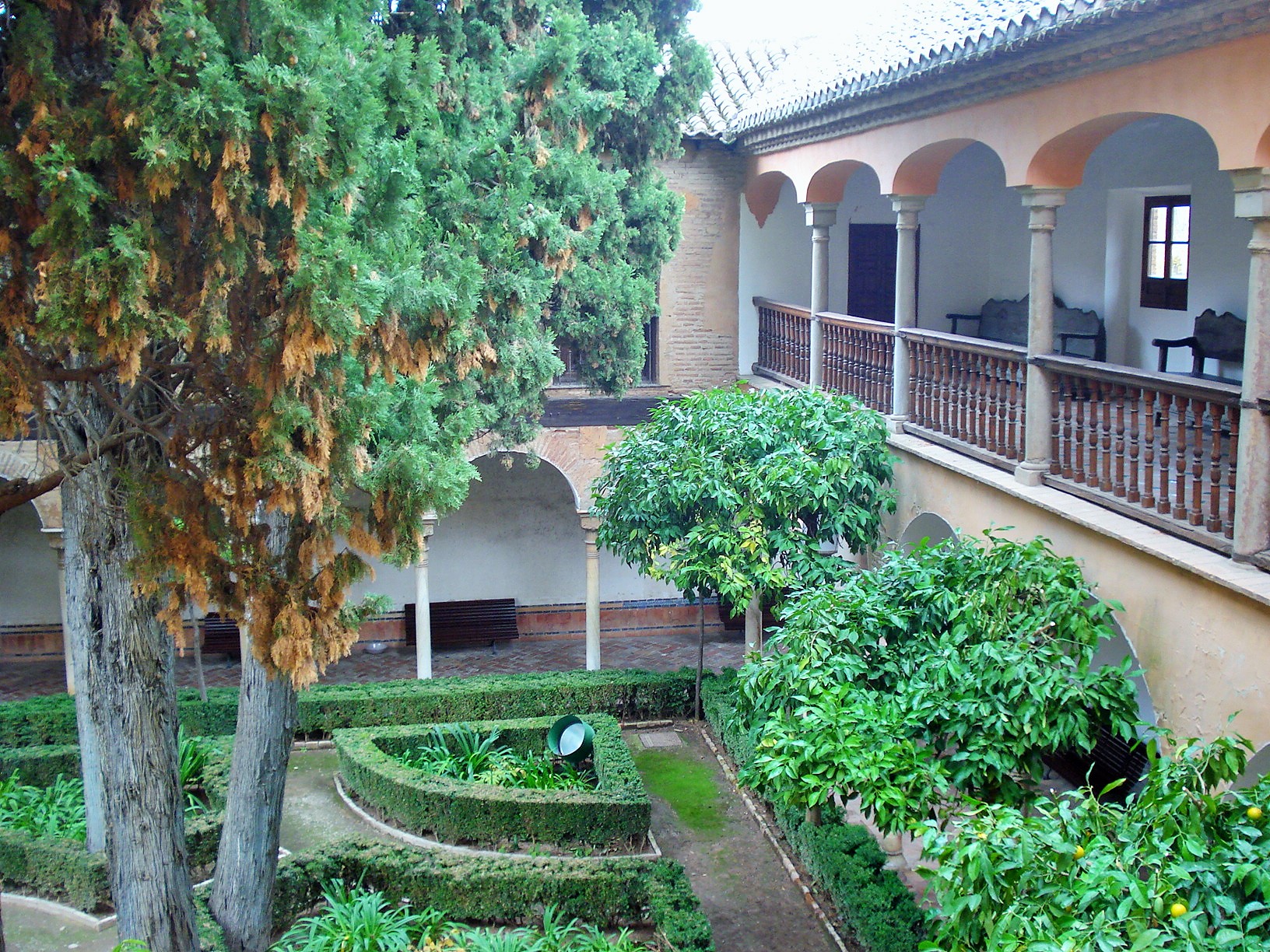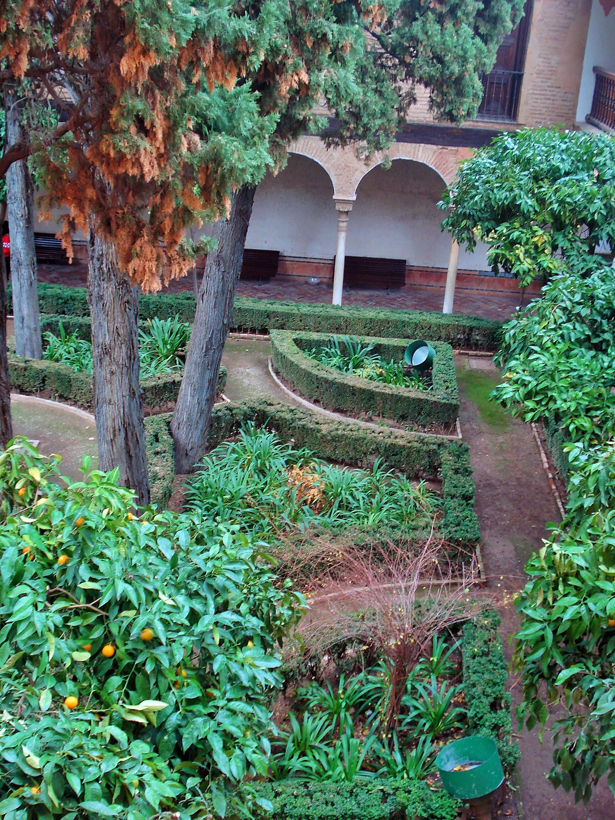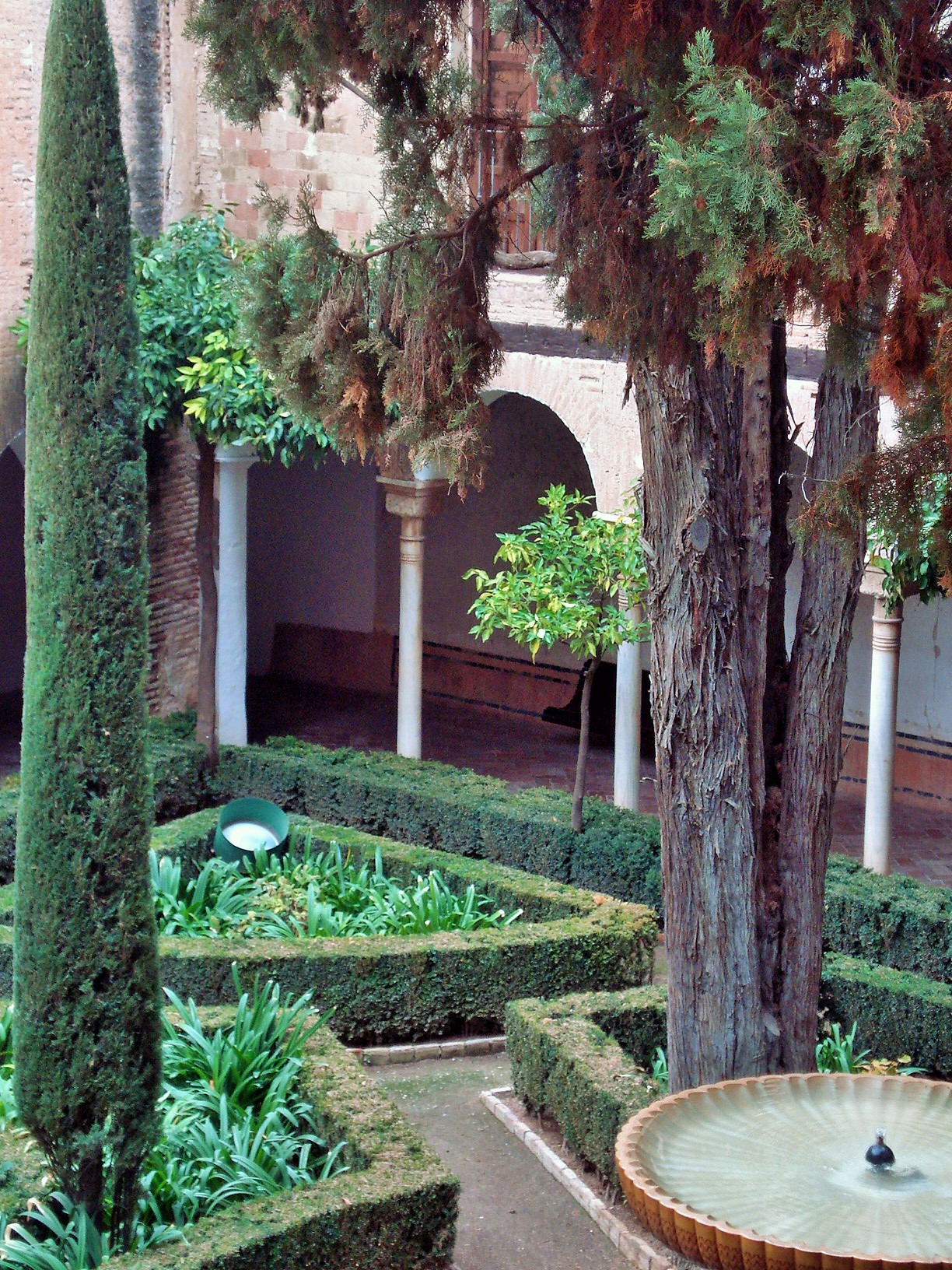 Granada, in southern Spain,  is of course most famous for the Alhambra and Generalife gardens.  The patios of the Alhambra are iconic images of Granada.  While not as famous as the Patio de los Leones, the Patio de Lindaraja is the most garden-like of the patios and a green oasis in this stunning palace. It is enclosed by arched columns and ornate galleries above, from which a sweeping view of the city below can be seen. From the garden below, the effect is almost monastic.