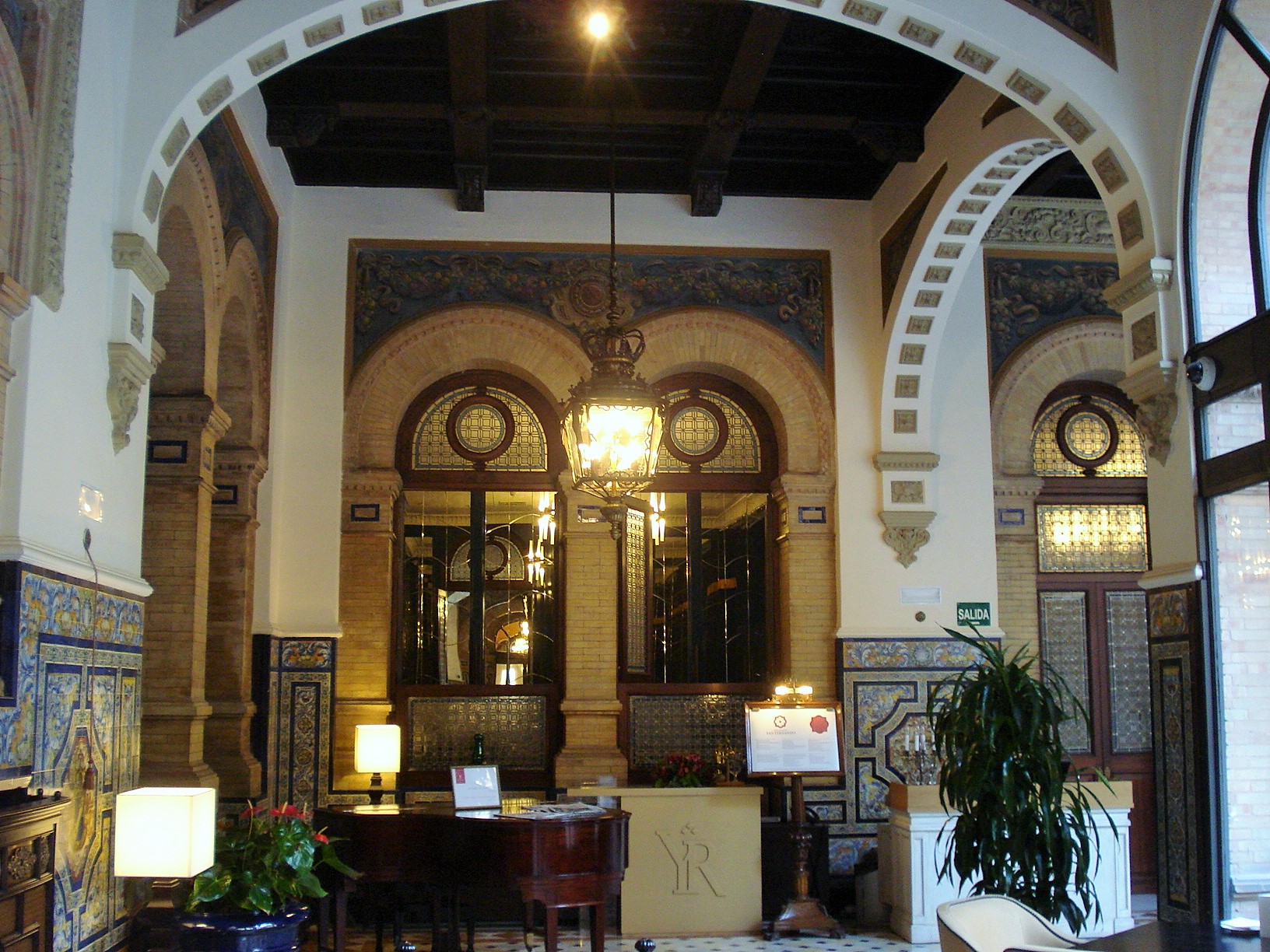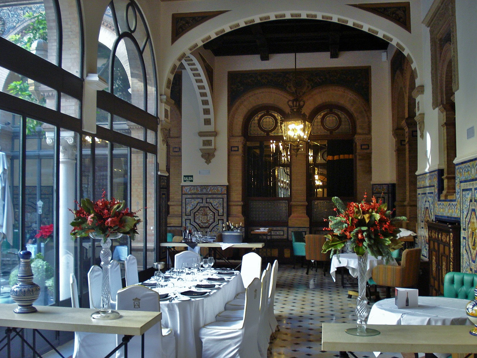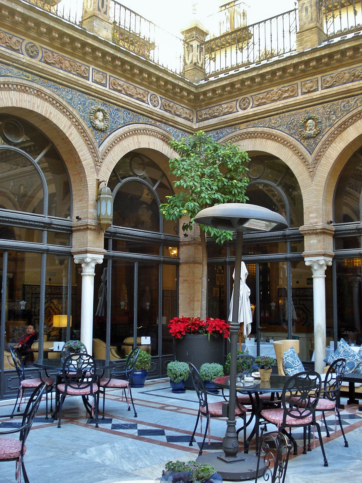 Hotel Alfonso XIII, or the Alfonso as it is often referred to, is a historic landmark building in old Seville, near the Cathedral and the Alcazar. Inaugurated in 1929, the year of the World Fair that was instrumental in bringing to Seville the Plaza de Espana and Maria Luisa Park, it is a materpiece of neo-mudejar, or neo-moorish style, architecture, with arches, tile murals and water features.  The patio is truly the heart of the hotel, with reception rooms, lounges, and the restaurant all laid out around it, and it is indeed a treat to spend a leisurely hour there having drinks or coffee there. The grounds outside are also landcaped in a distinctly Andalusian style.