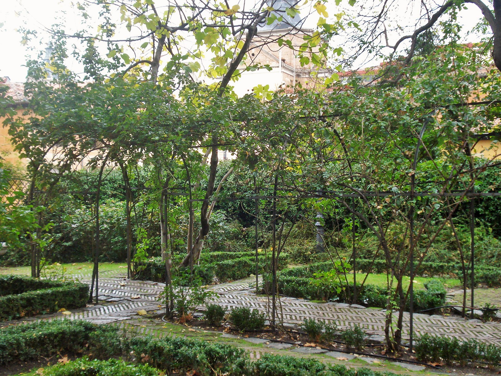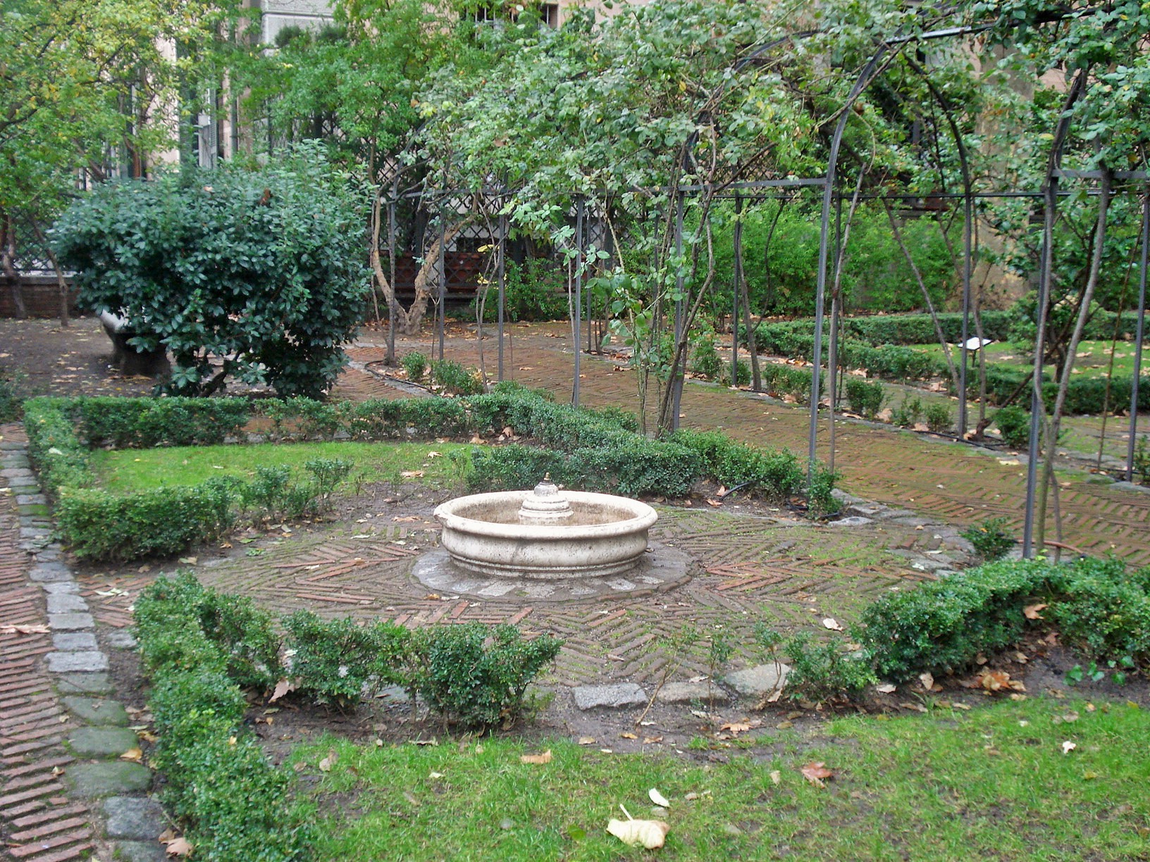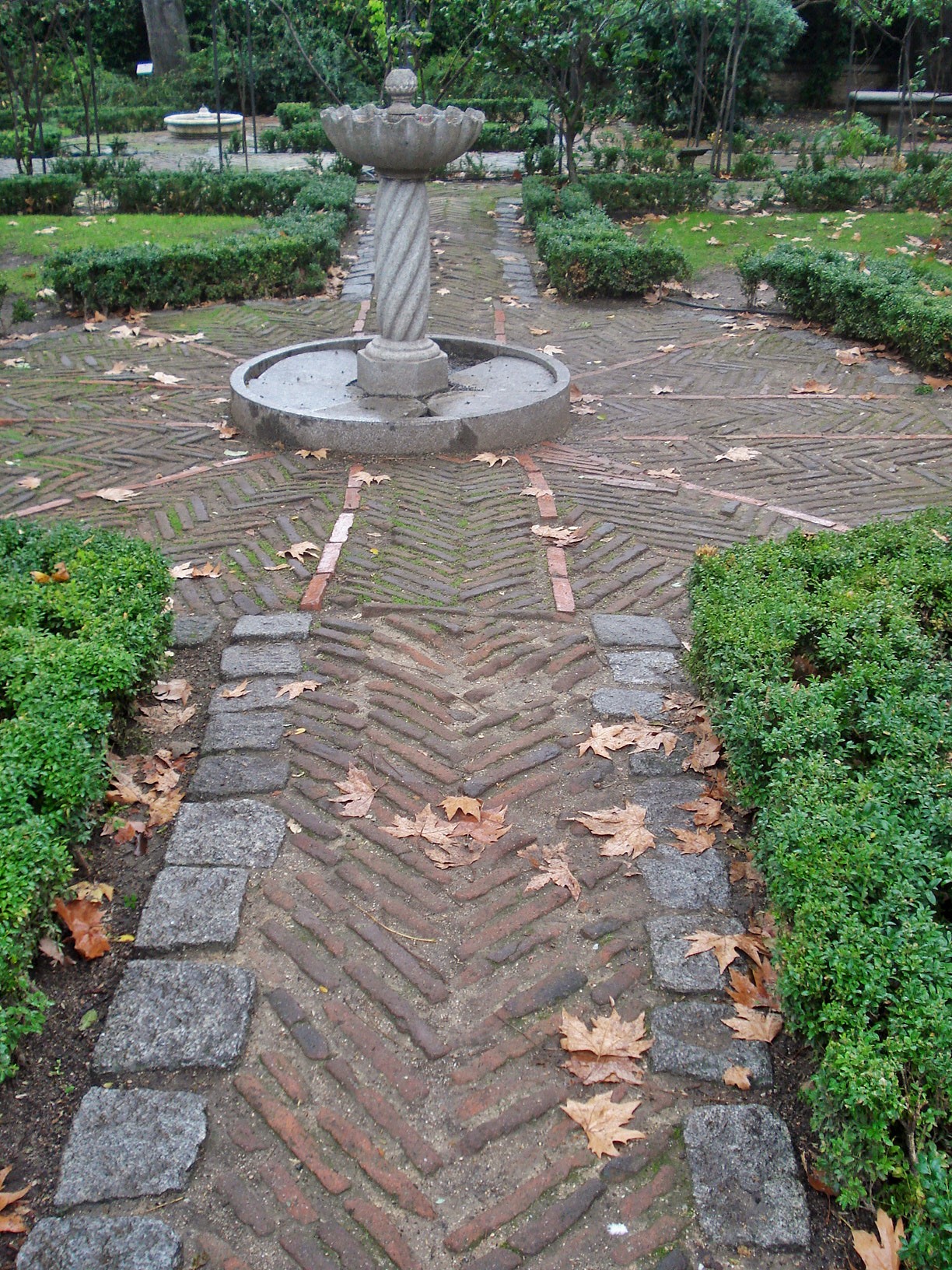The gardens are planted with tall cypress edges, while boxwood in a grid pattern edges rose gardens. The water features are the focal point of these gardens, and the entire perspective follows the large pools framed in by the plantings.