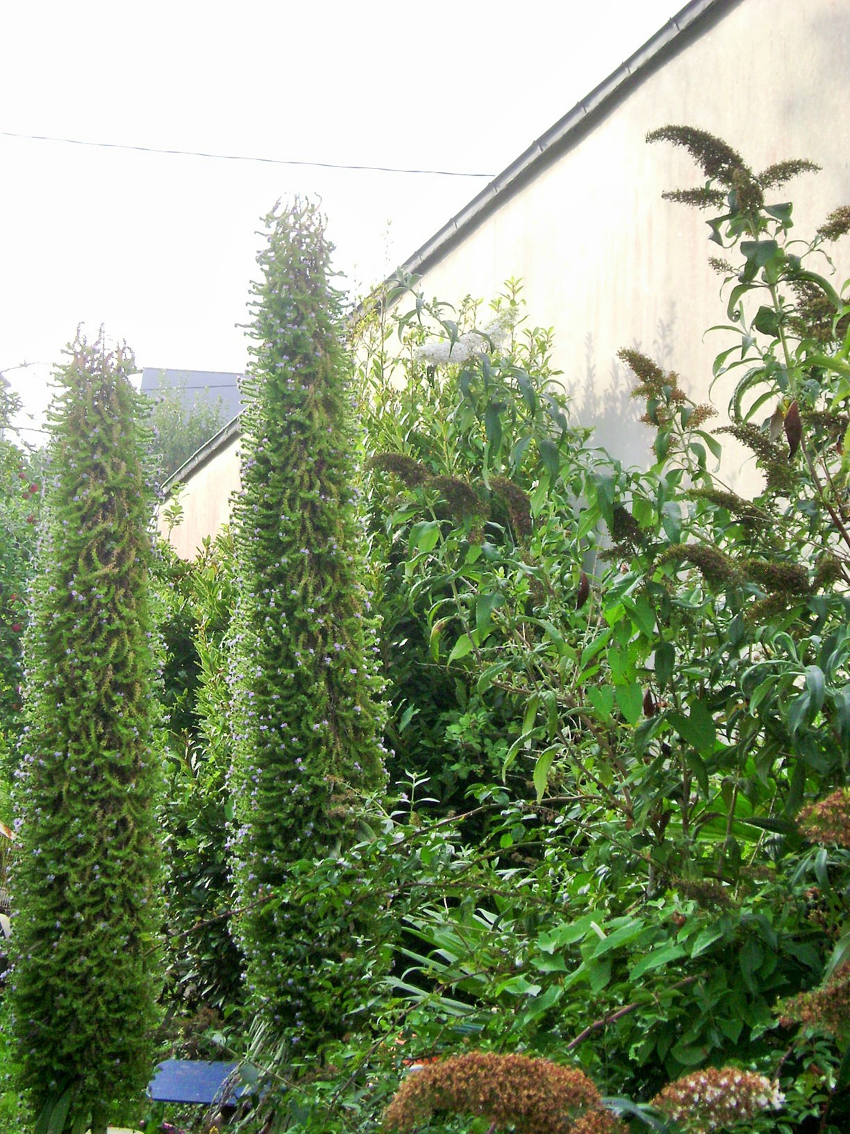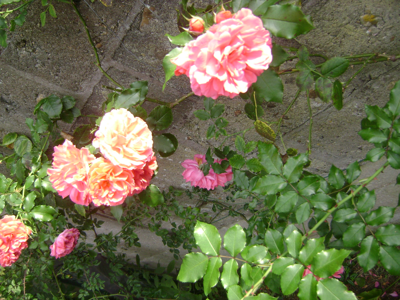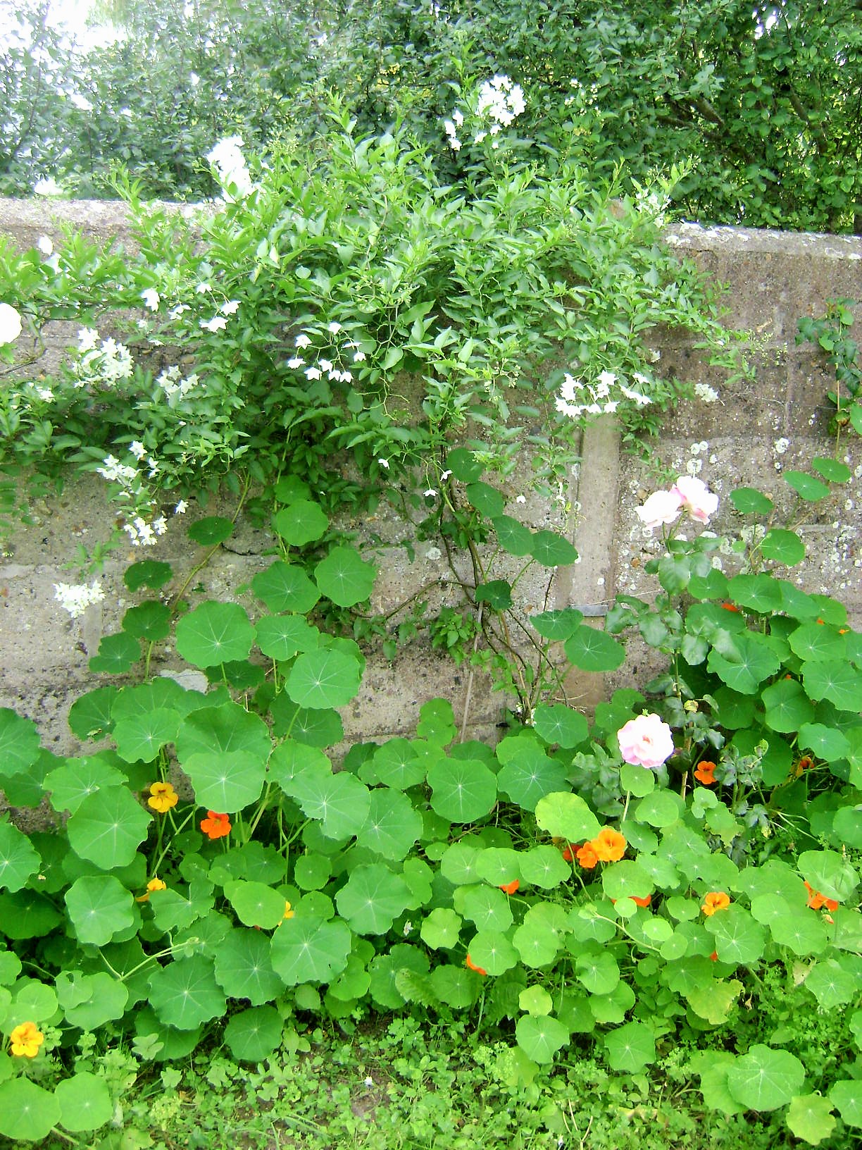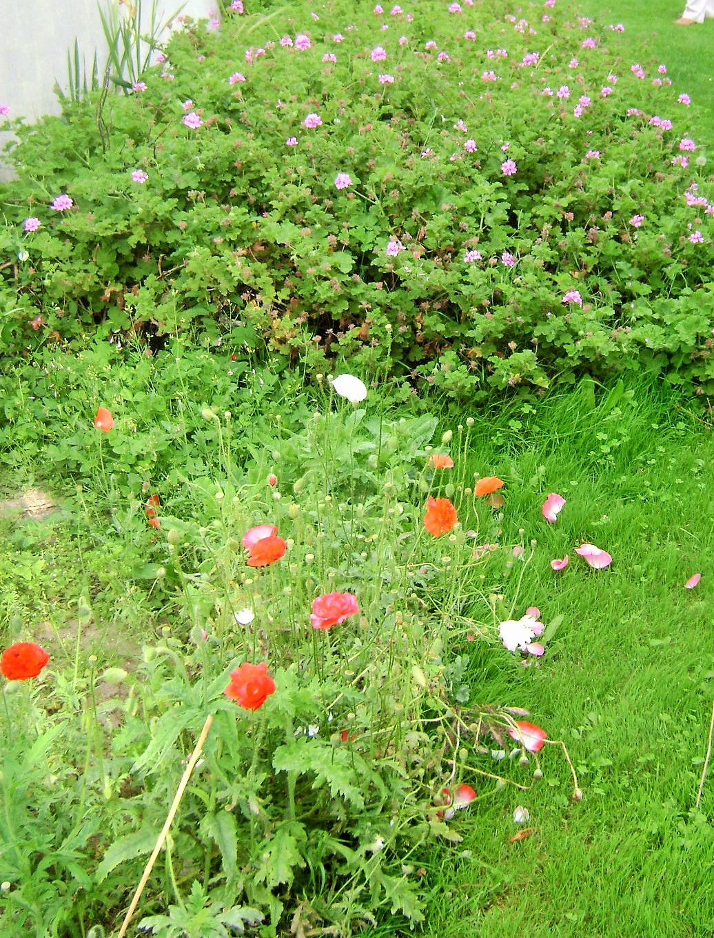 Mixed borders are edged with low trimmed boxwood, and more boxwood and evergreens in round shapes mix with roses, sedums and other plants.