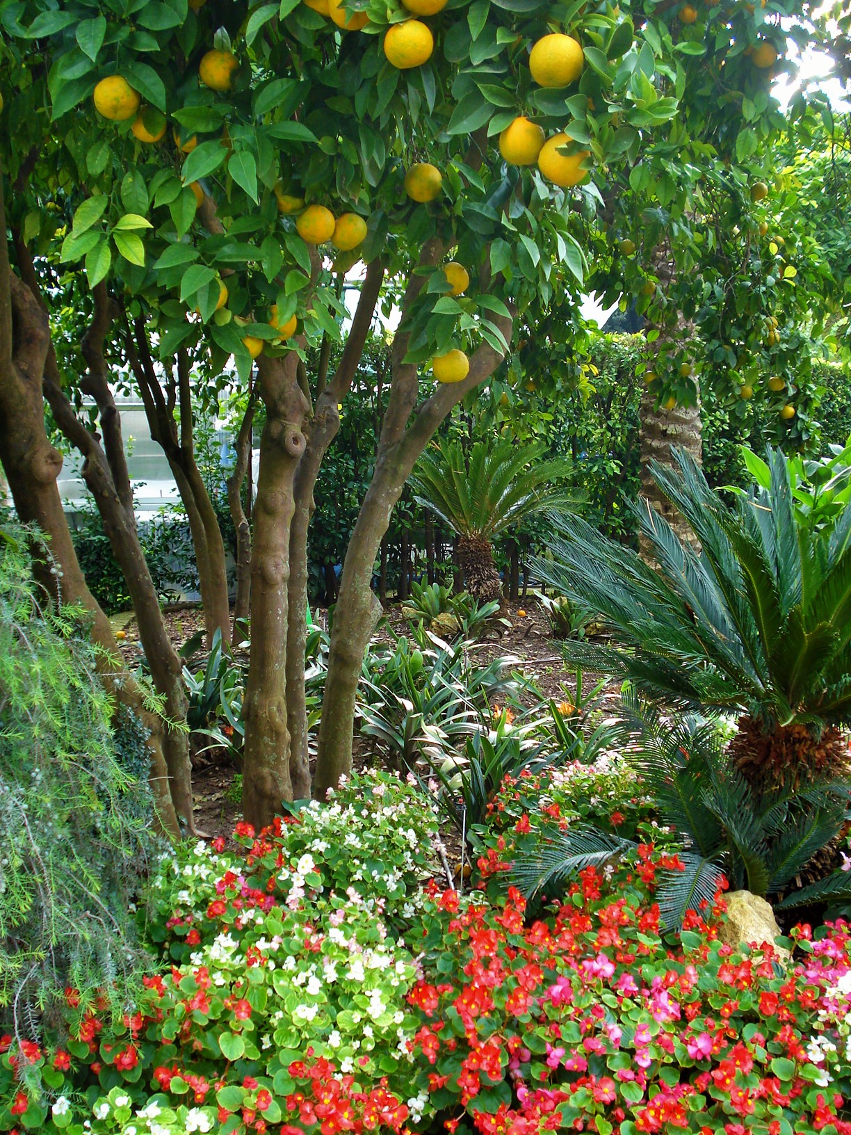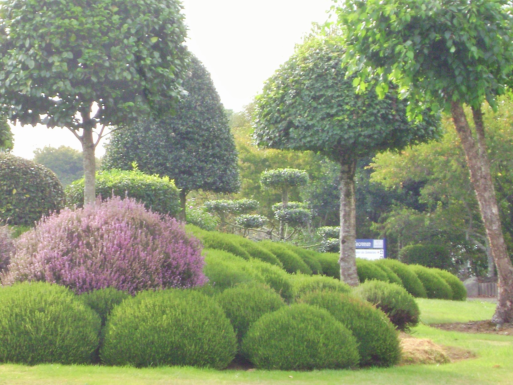The hedges all around mix a variety of shrubs for texture, foliage and blooms, together with perennials for touches of colors. The fall blooms of the dahlia borders add magical color to the fall garden. Hostas and other shade loving plants fill shadier corners.